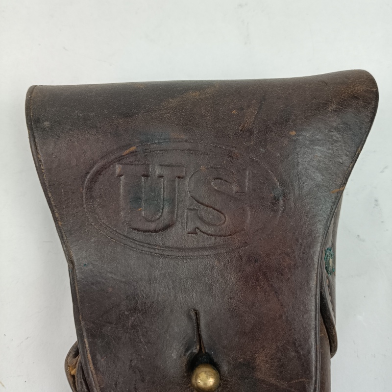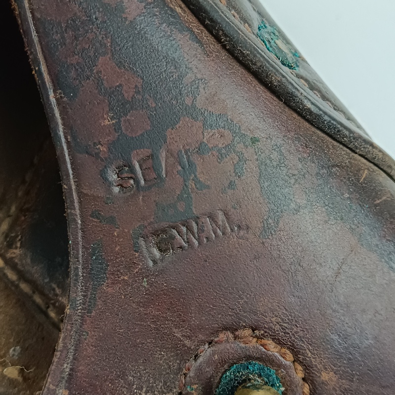 Dentro de la pistolera se aprecian los marcajes “SEARS G.W.M.” correspondiente a Sears Saddlery Co., Davenport, Iowa; y las iniciales del inspector. Fabricacion de Primera Guerra Mundial hacia 1918.