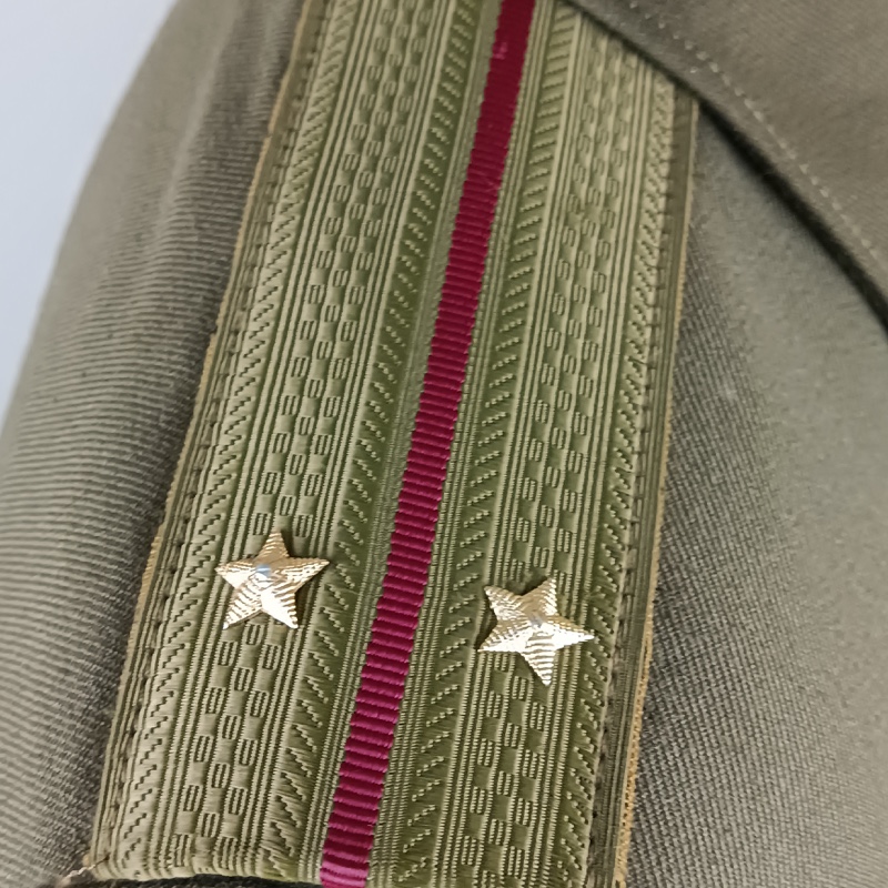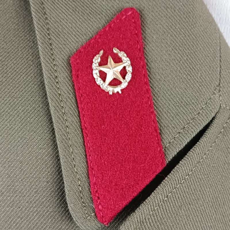 Modelo con cierre frontal oculto, cinturón ajustable y palas de hombro con divisas de teniente. Presenta en el cuello insignias con emblema metálico de infantería motorizada.