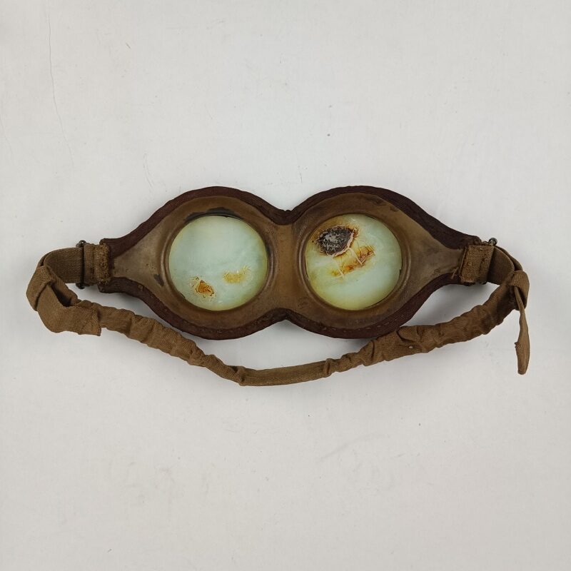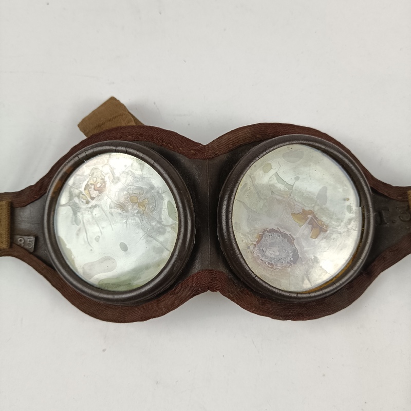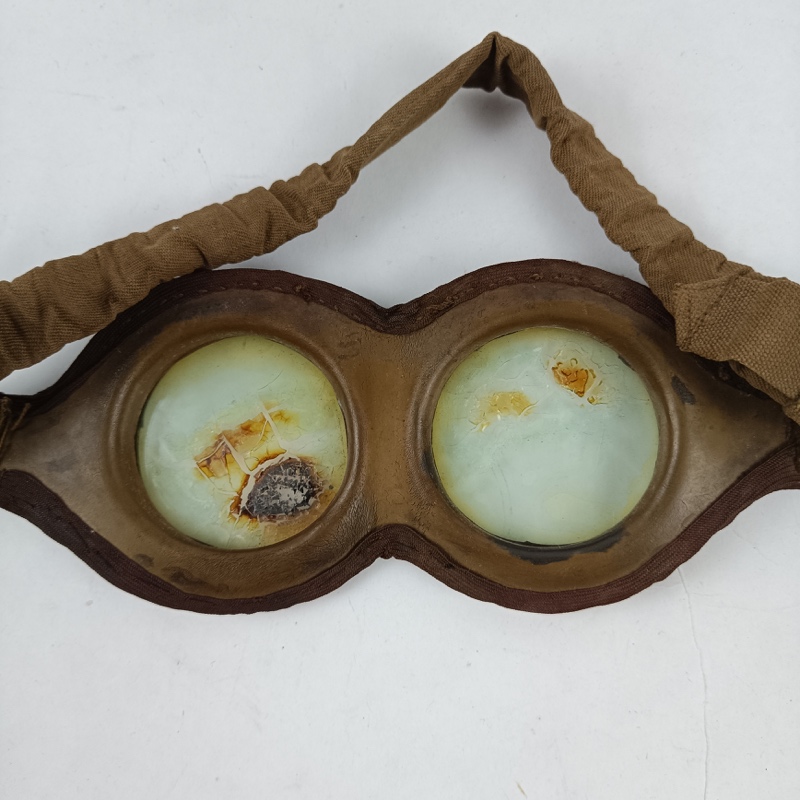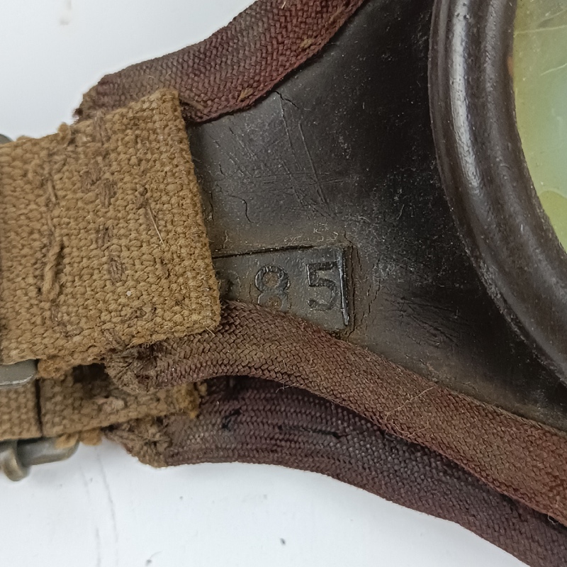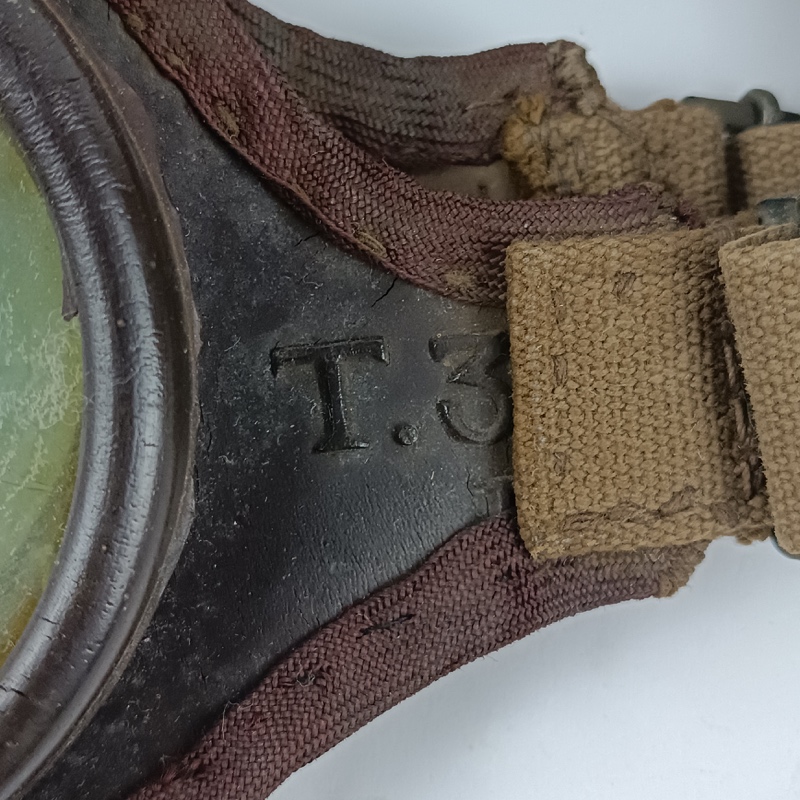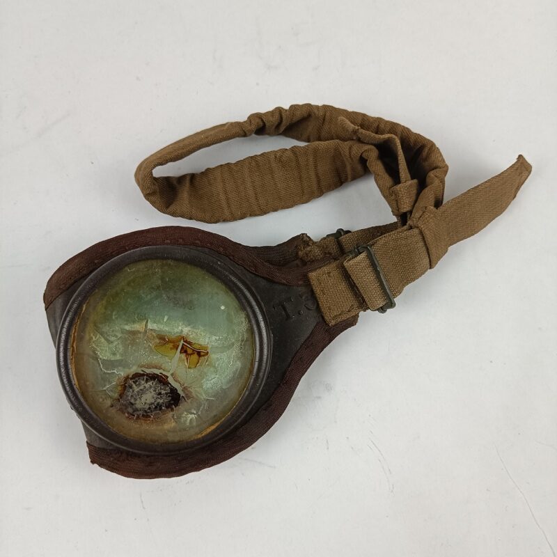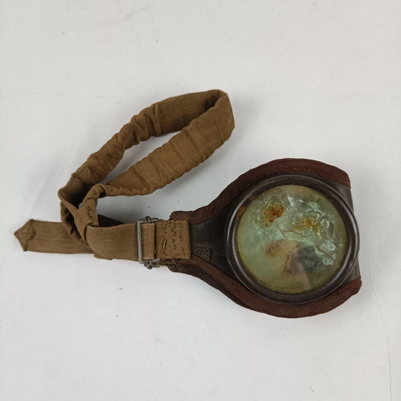 Gafas recortadas de la máscara de gas, con un ribeteado de tela para ocultar el corte. Sujeción mediante una correa sacada directamente de la propia máscara, con ajuste elastico. Modificación de campo probablemente hecha a partir de una máscara rota, para usarla como gafas de motorista.