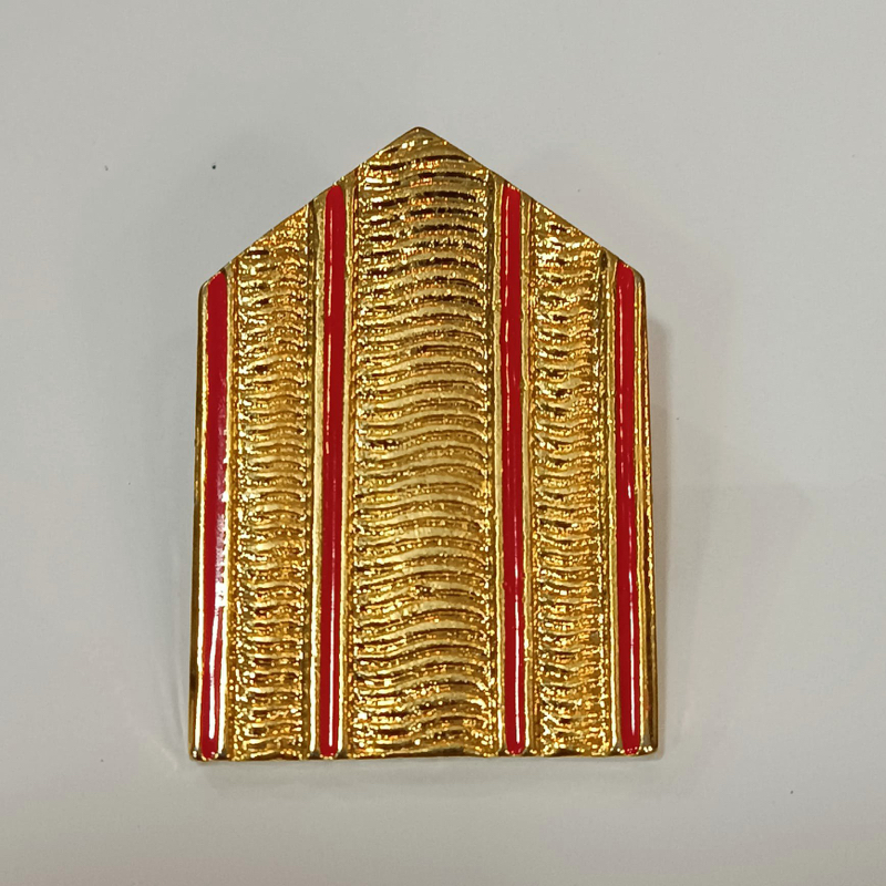 Insignia metálica con un enganche en la parte posterior de la misma mediante rosca. Formado por tres franjas doradas separadas por líneas de color rojo, utilizadas por el ejército de tierra.