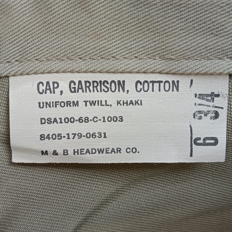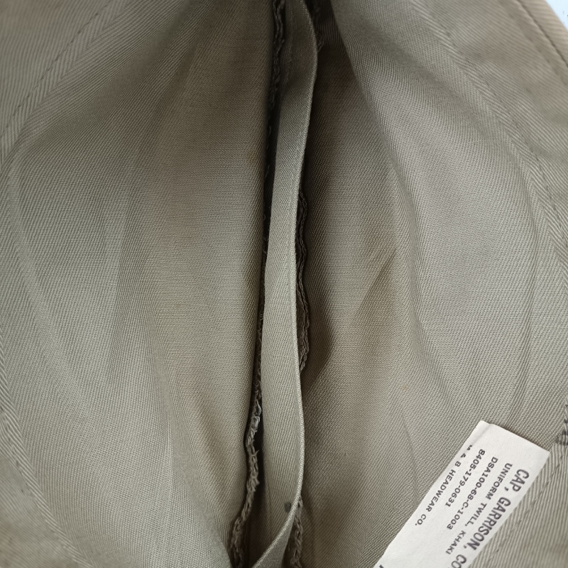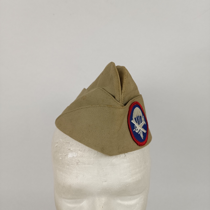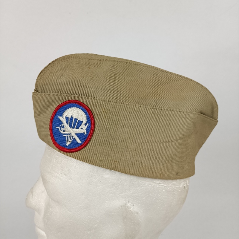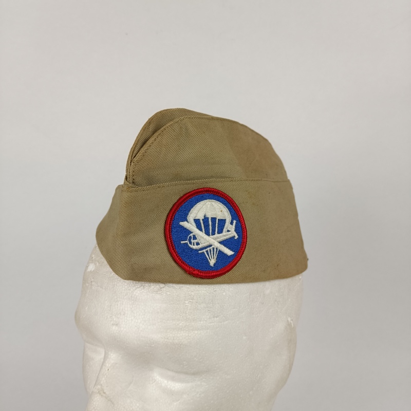 Gorra cuartelera original de verano, Fabricada en sarga de algodón color caqui en el año 1968 con distintivo bordado de paracaídas. Emblema de las unidades aerotransportadas. Etiqueta original interior con código DSA y fabricante “M & B Headwear Co.”. Talla 6 3/4 (US).