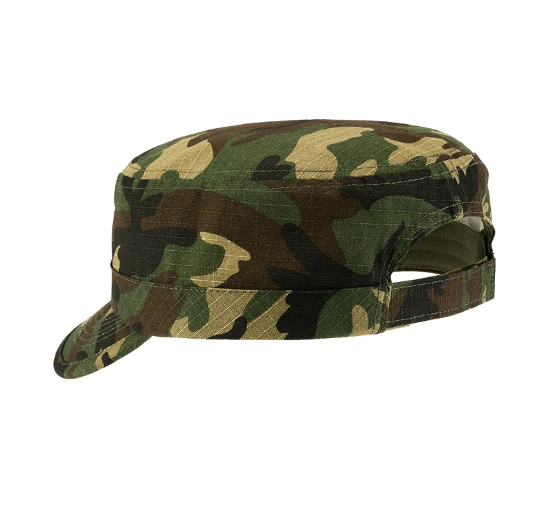Gorra estilo militar BDU fabricada en resistente tejido ripstop con patrón de camuflaje Woodland.