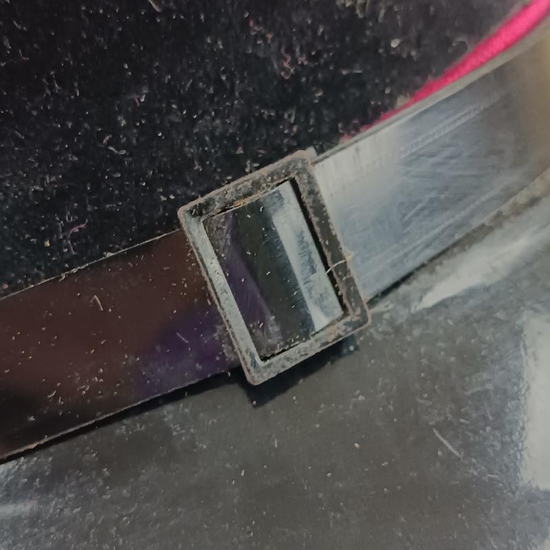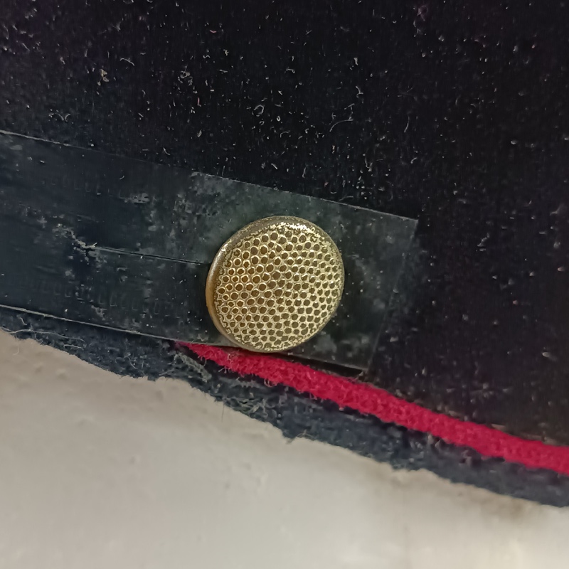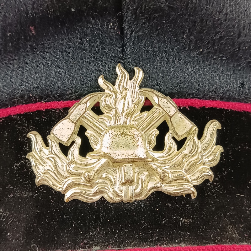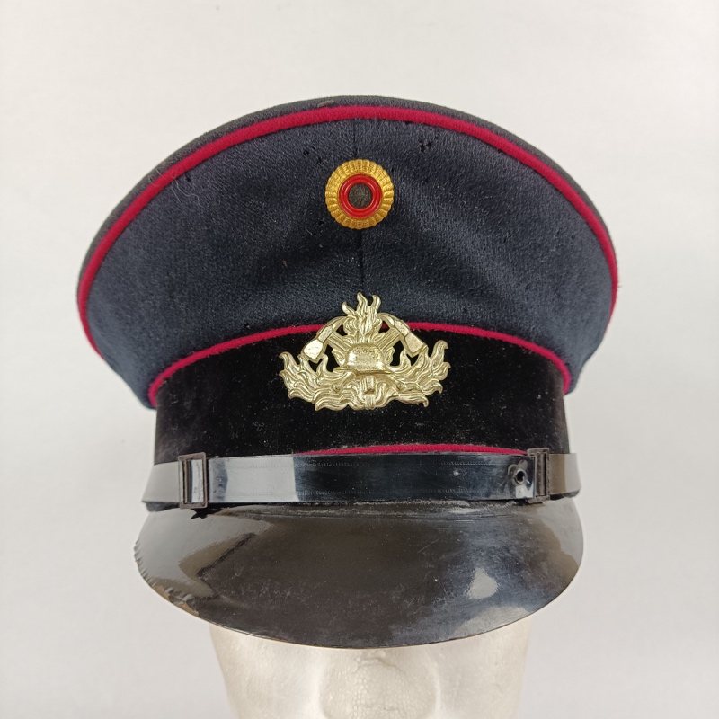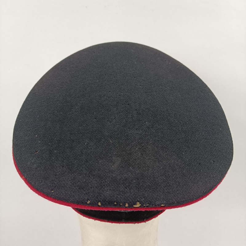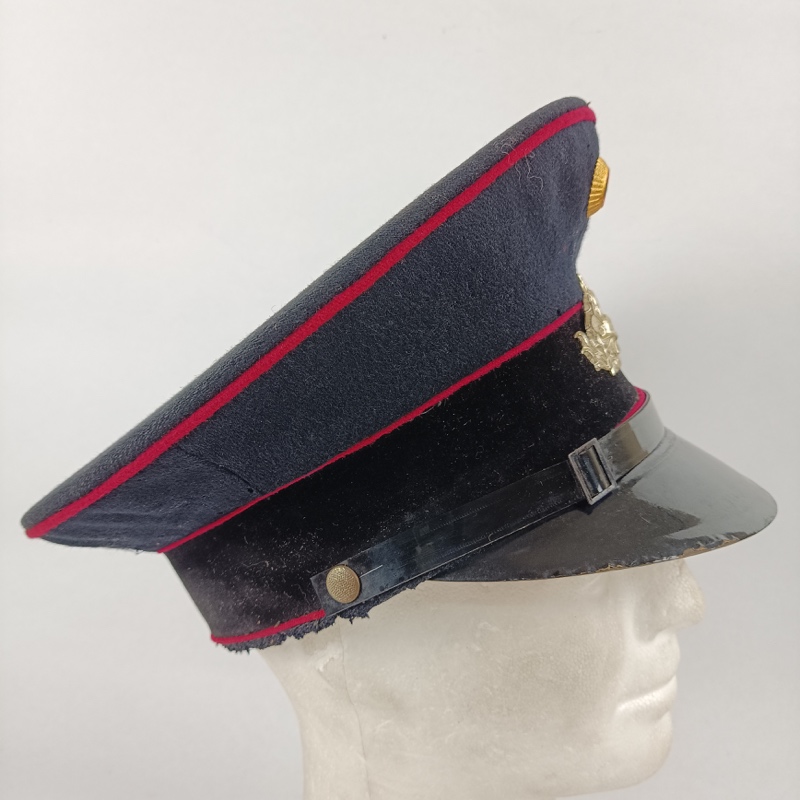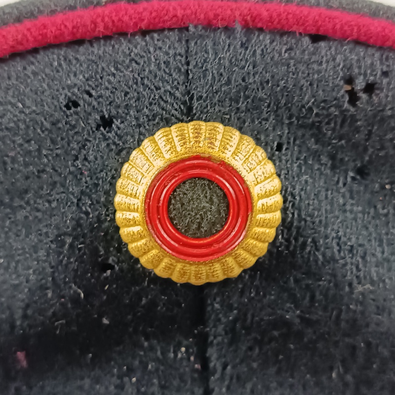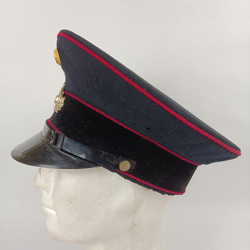 Gorra azul marino con banda negra y ribeteado rojo. Insignia metálica en el frontal.