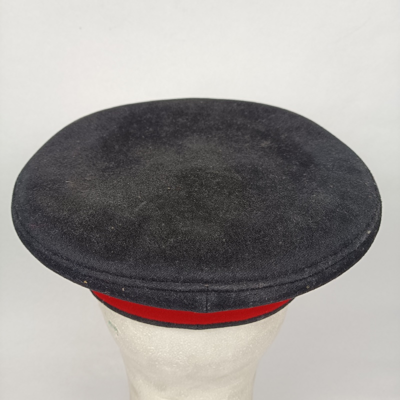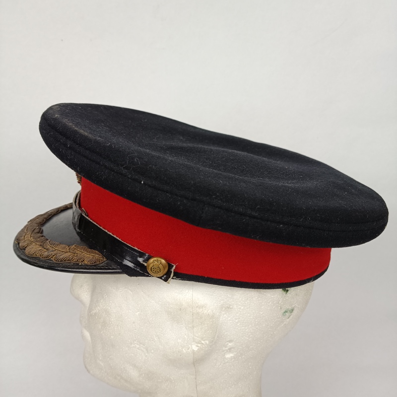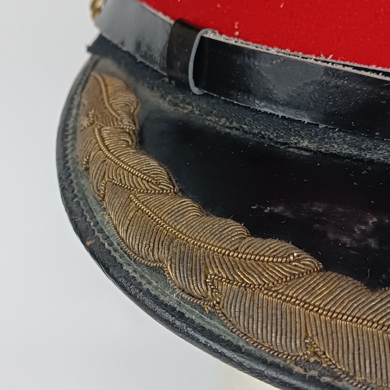 Gorra negra con banda de color rojo sobre la cual se aprecia un grueso parche de bullón con canutillo de oro e hilo metálico, de gran calidad, para Oficiales Superiores. Visera con un grueso entorchado bordado directamente sobre la misma. Barboquejo formado por una correa de cuero unida mediante dos botones metálicos en relieve.