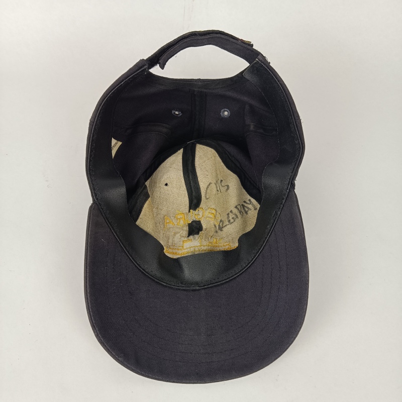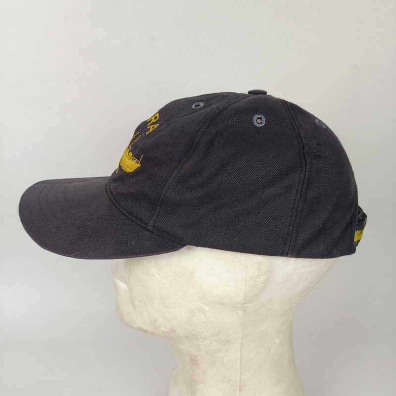 Gorra universal con velcro en la parte posterior, usada, pero completa. Bordada en amarillo, con el nombre y designación del barco ademas del perfil del mismo.