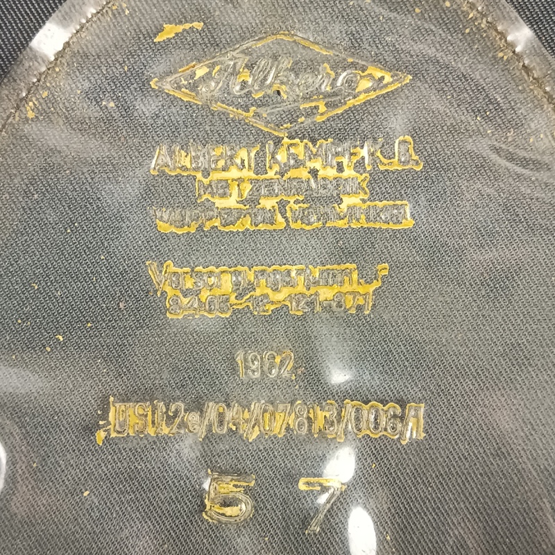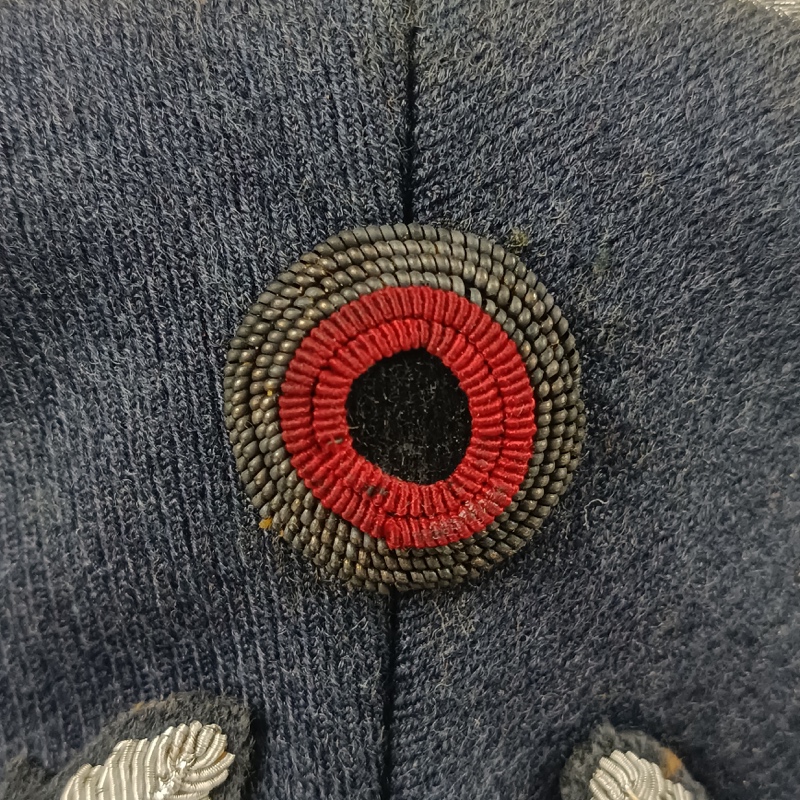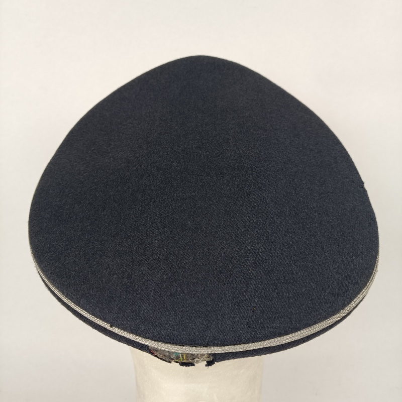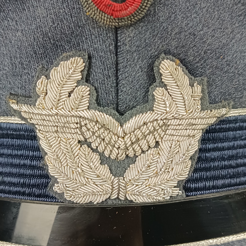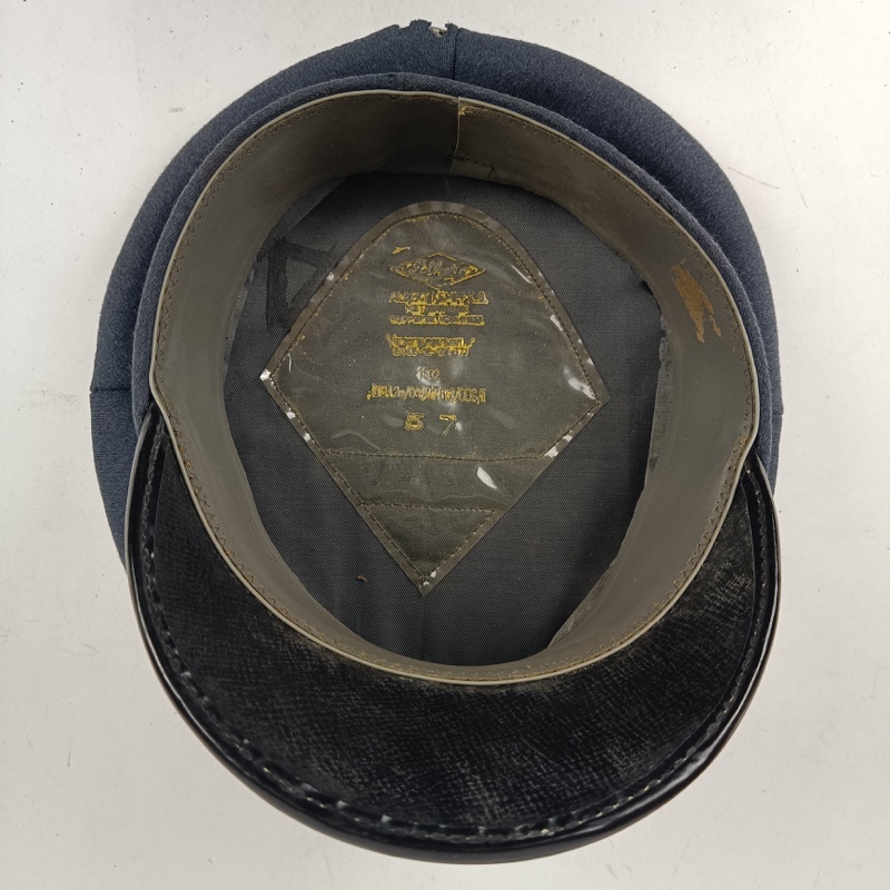Confeccionada en paño azul grisáceo, con escarapela nacional bordada en hilo, insignia de vuelo bordada al frente, barboquejo de charol negro y ribeteado plateado en visera y corona. Interior marcado por el fabricante “Albert Kempf”, Pieza original en excelente estado de conservación, talla 57.
