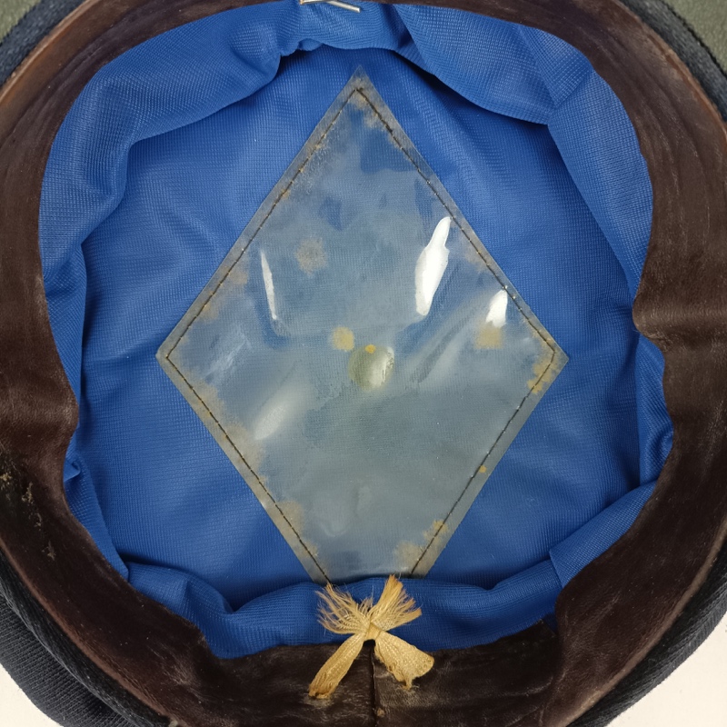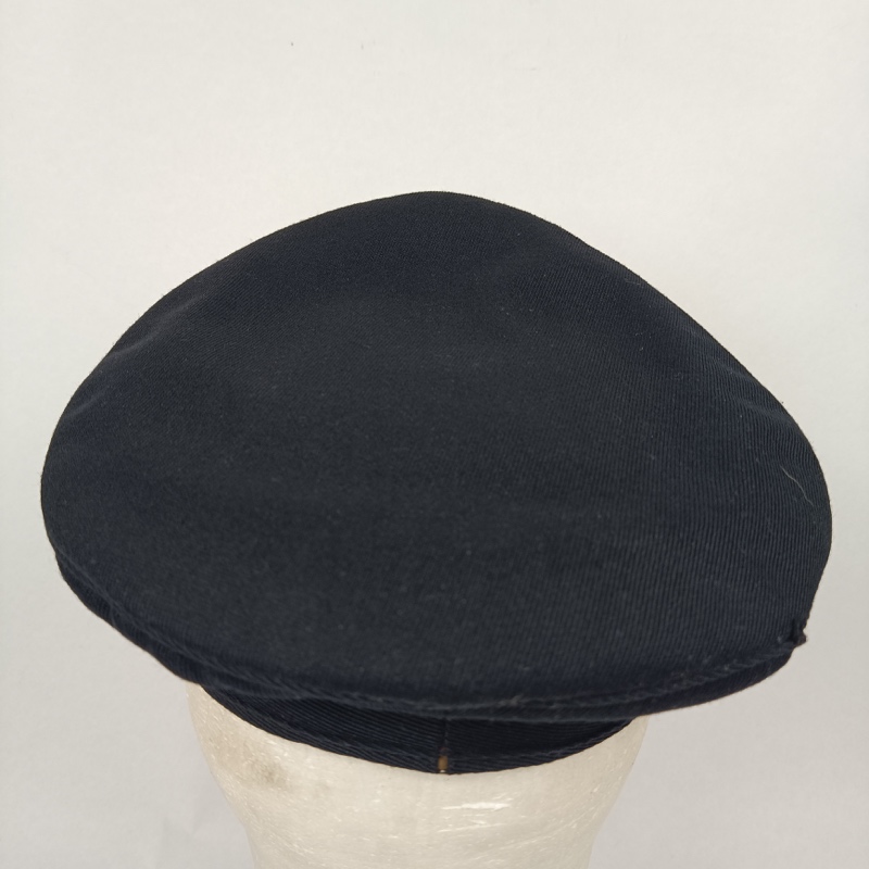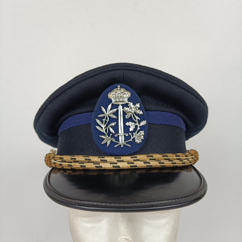 Confeccionada en tejido azul marino, con banda azul media y visera negra brillante. El frontal luce una insignia plateada bordada sobre fondo azul, con corona real, espada y ramas de laurel y roble cruzadas. Cordón dorado trenzado con detalles negros, sujeto por botones metálicos. Interior forrado en azul con visera interna verde y sudadera de cuero.