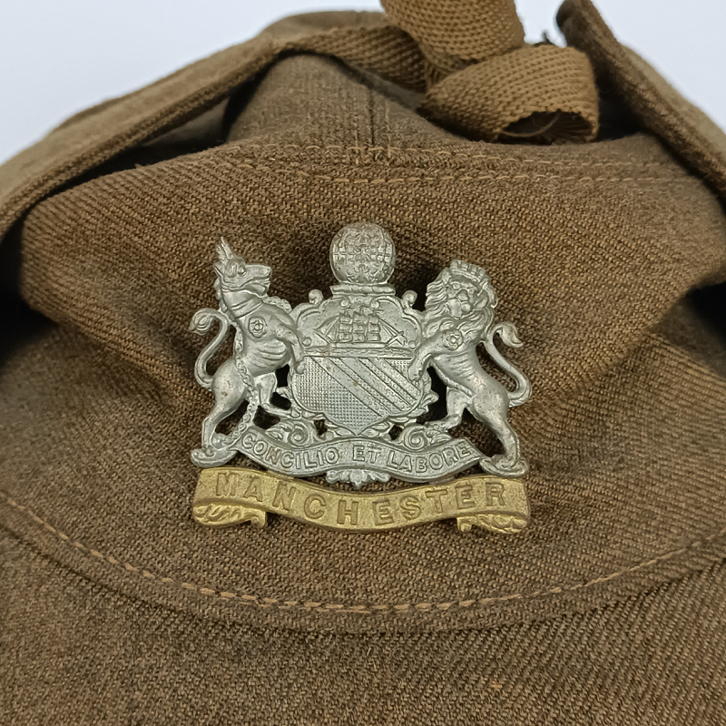 Insignia en el frontal metálica perteneciente al Regimiento de Manchester, regimiento de infantería de línea del Ejército británico que existió desde 1881 hasta 1958 y que combatió durante la Segunda Guerra Mundial.