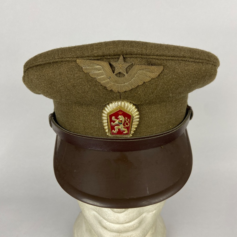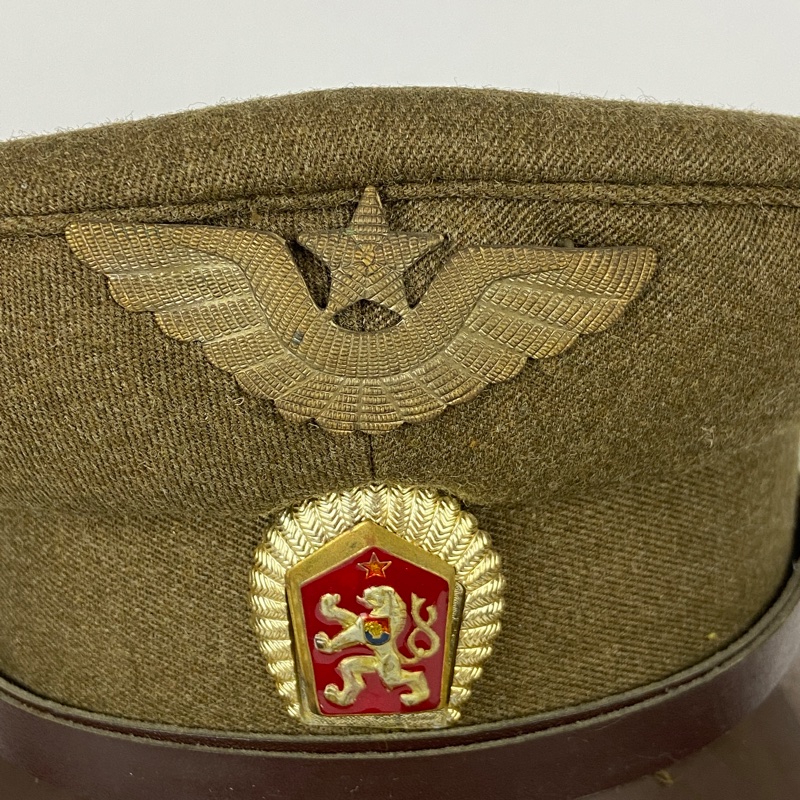 Gorra de color marrón verdoso con barboquejo y visera marron. Símbolo de Checoslovaquia en el frontal y en la parte superior alas para uso por la aviación.