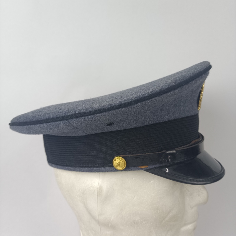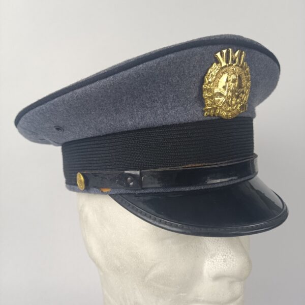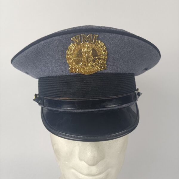 Gorro de color gris con ribeteado negro, a juego con la banda frontal. Barboquejo y visera negros con acabado charolado. Placa frontal metálica del VMI unida mediante rosca. en muy buen estado de conservacion.
