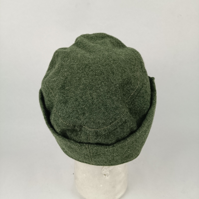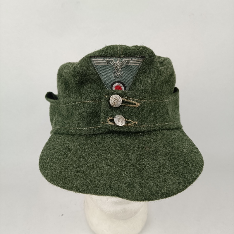 Gorra de color feldgrau que presenta paneles plegables en los costados, los cuales se unen en el frente de la misma mediante dos botones. En el frontal la gorra lleva cosida a mano un águila nacional tejida a máquina con las alas extendidas, sosteniendo una esvástica. Bajo la misma una escarapela nacional tricolor en hilos de rayón negro, blanco y rojo.