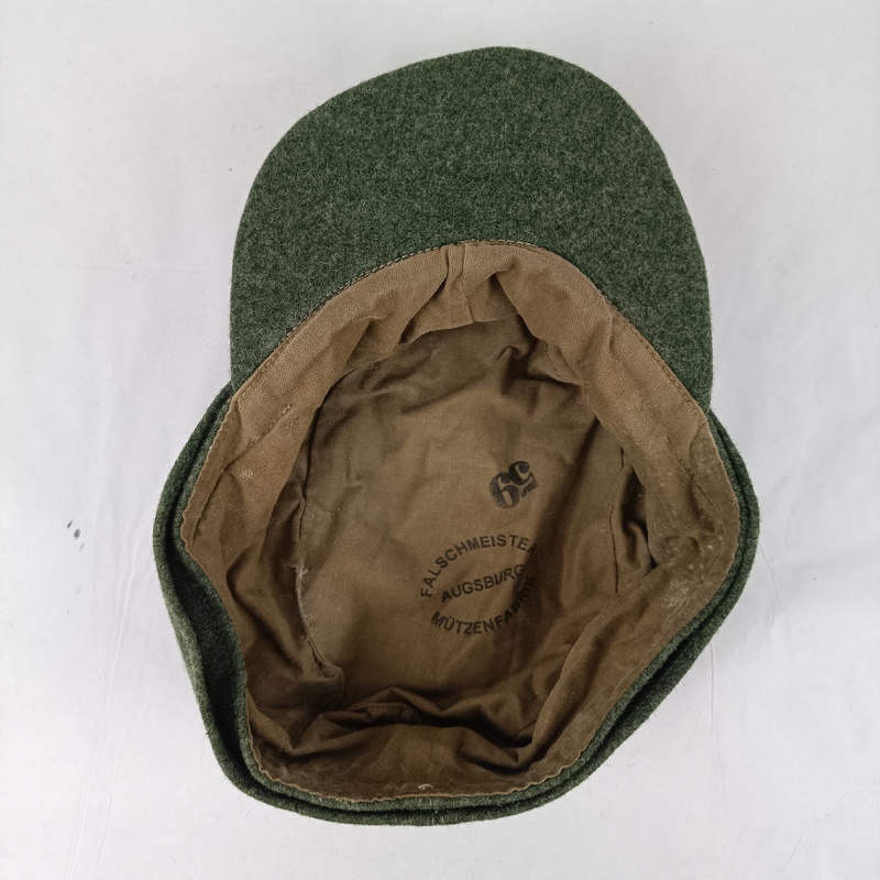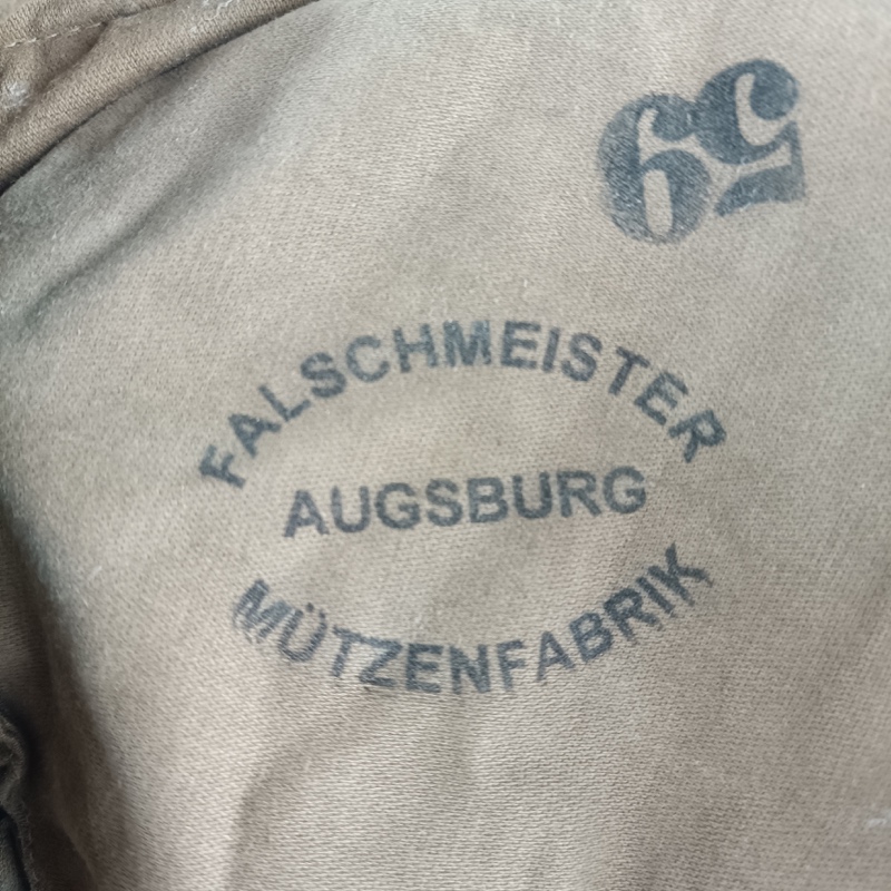 El interior de la gorra forrado en algodón con marcaje FALSCHMEISTER AUGSBURG MÜTZENFABRIK y la talla 59. Modelo de tropa sin ribeteado en la parte superior de la misma. Visera doblada en el centro que no afecta mucho a la apariencia de la misma.