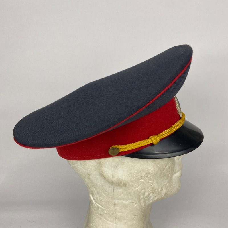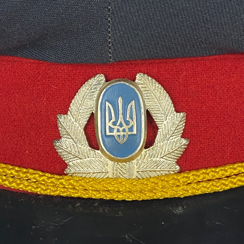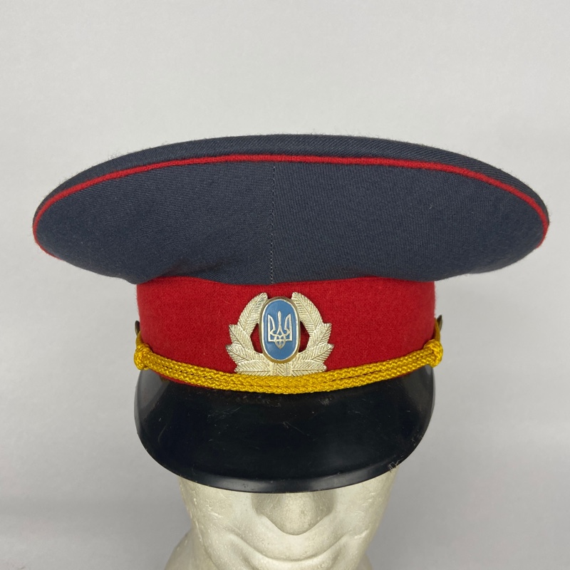 Modelo de estilo soviético con insignia en el frontal de Ucrania. Barboquejo de cordón amarillo con dos botones en los costados con el símbolo de Ucrania. Modelo de Policía o Ministerio del interior.
