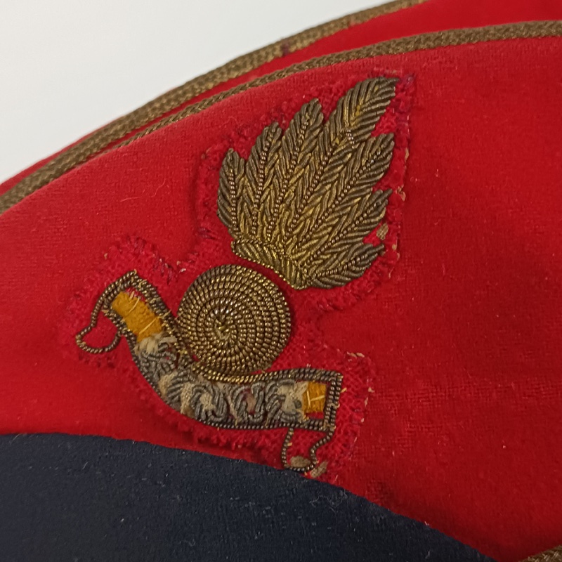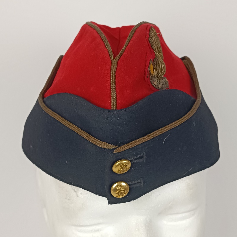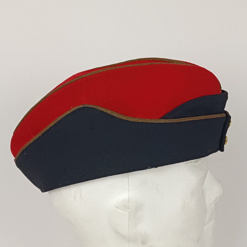 Modelo de oficial con ribeteado dorado grueso que recorre la parte superior de la misma. Gorro de dos colores con la parte superior roja y la inferior negra, fabricado en lana con acabado suave aterciopelado. En la parte frontal lleva dos botones de latón.