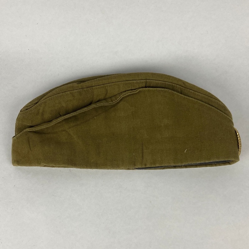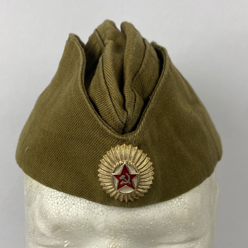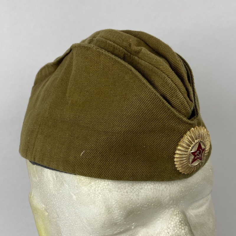 Pilotka soviética de campaña en color caqui, modelo clásico utilizado por el Ejército Soviético durante el periodo de posguerra y la Guerra Fría. Presenta en el frontal una insignia para Oficial del Ejercito.