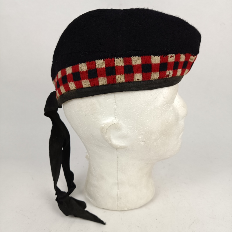 Gorro de lana gruesa de color azul oscuro con su característico pompón rojo en la parte superior del mismo. Insignia metálica en uno de los laterales perteneciente al King’s Own Scottish Borderers. Modelo con tartán decorativo que rodea completamente la prenda.