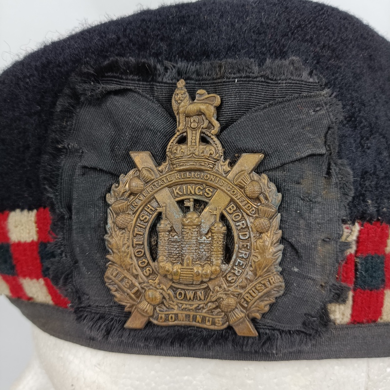 Gorro Glengarry perteneciente al King’s Own Scottish Borderers del Ejército Británico. Gorra característica utilizada por las unidades de Highlanders de Escocia. Modelo de Segunda Guerra Mundial o inmediata posguerra, con insignia con corona del rey, previa a 1952.