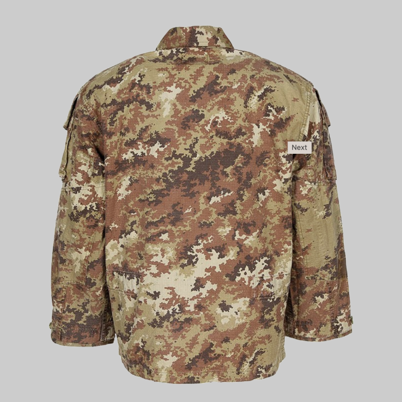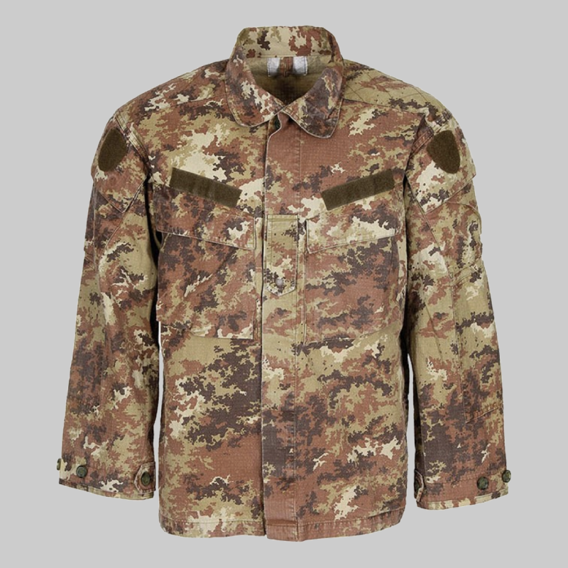 Guerrera en camuflaje Vegetato del Ejército de Italia, en tonos verdes y marrones.