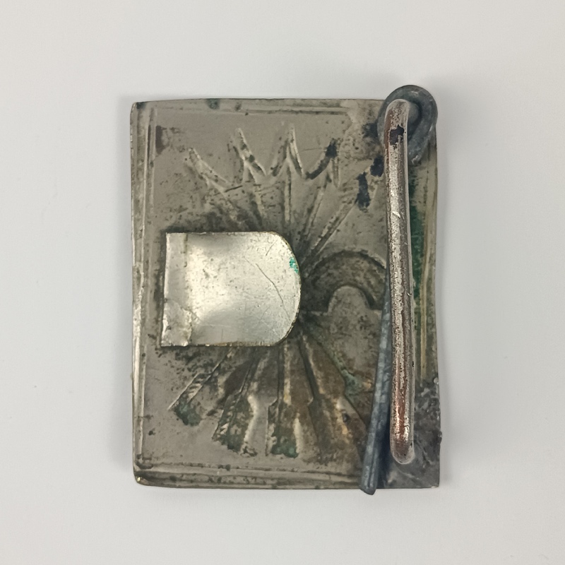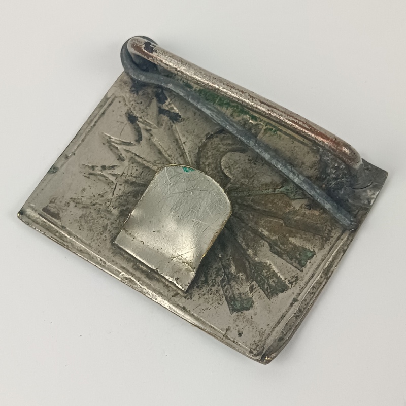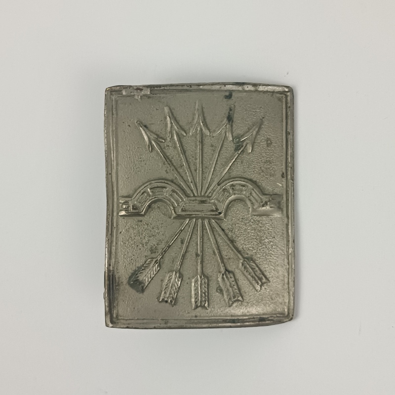 Hebilla de Falange Española, metálica con el símbolo de la Falange Española estampado en relieve en el frontal de la misma. Guerra Civil y años 40.