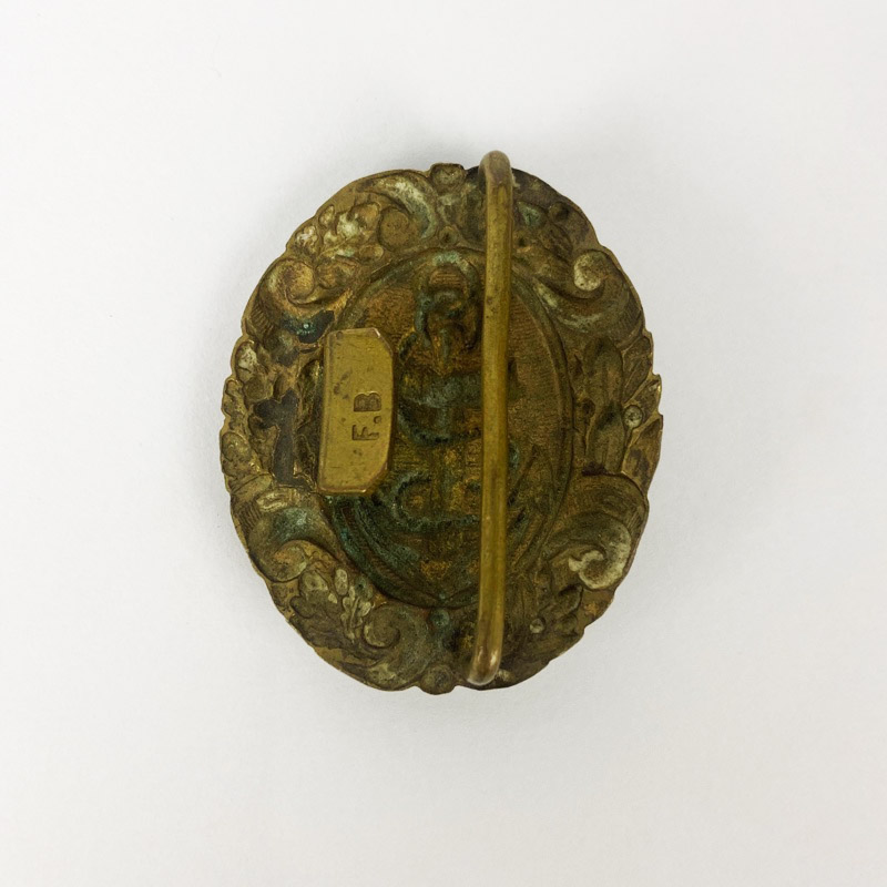 Hebilla de latón maciza con enganche en la parte posterior para unir al extremo del cinturón. Marcaje F.B. bien visible en la parte posterior de la misma.