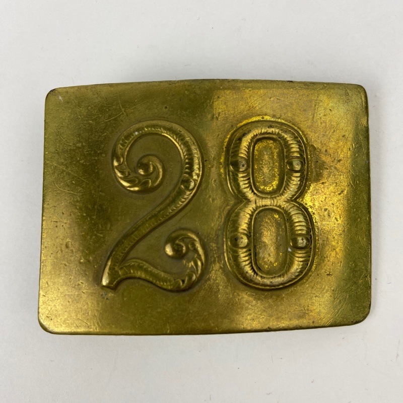 Hebilla metálica en latón correspondiente al Regimiento de Infantería nº 28 “La Victoria”, utilizada durante la época de Alfonso XIII. Presenta en el frontal el número 28 en relieve, distintivo identificativo del regimiento.