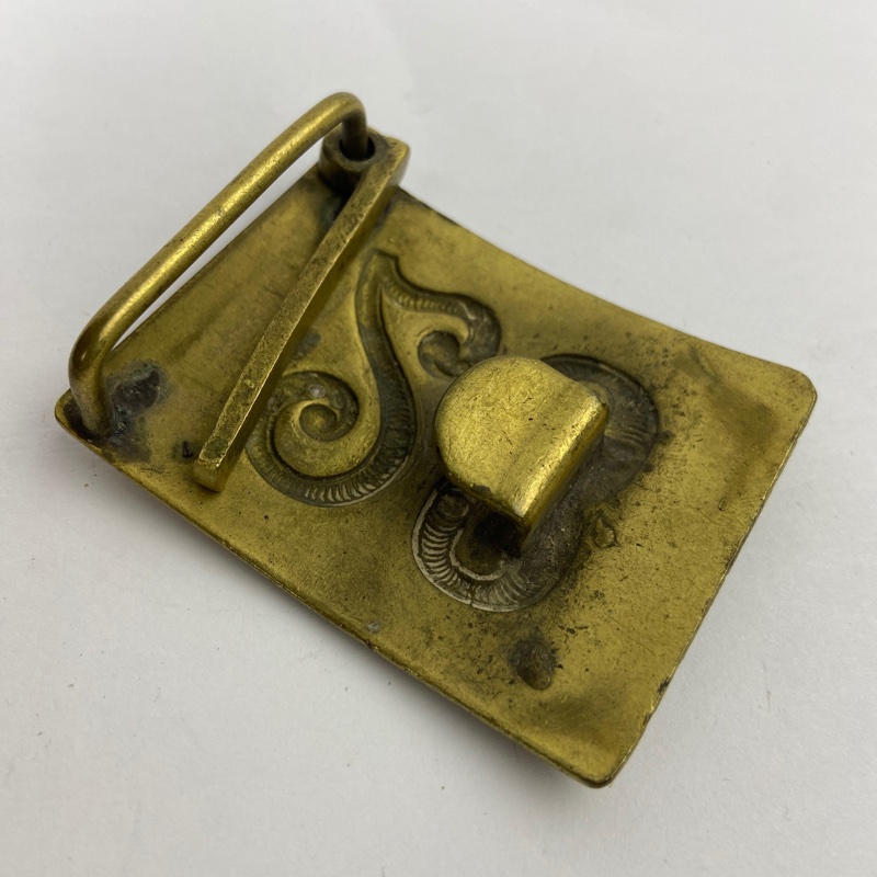 Ejemplar con sistema original de hebilla y pasador en la parte posterior. Fabricada en latón, con desgaste y pátina acorde a su uso y antigüedad.