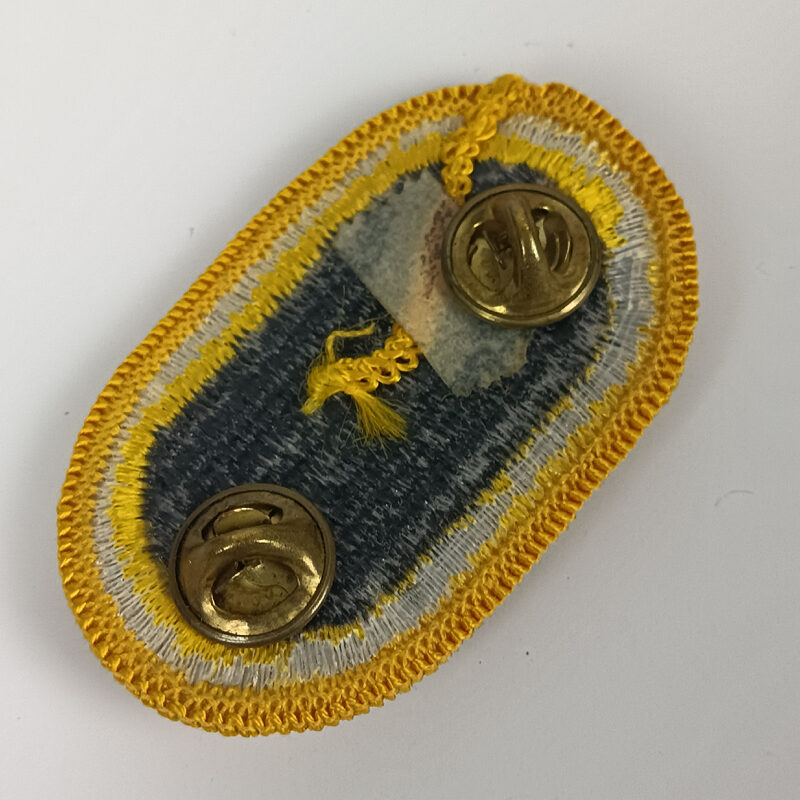 Distintivo con dos enganches tipo pin que atraviesan un parche con los colores de la unidad, para colocar sobre el bolsillo del uniforme. En muy buen estado.