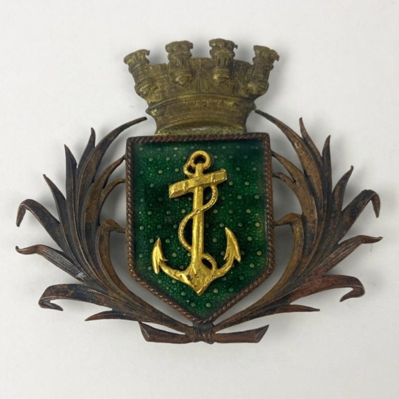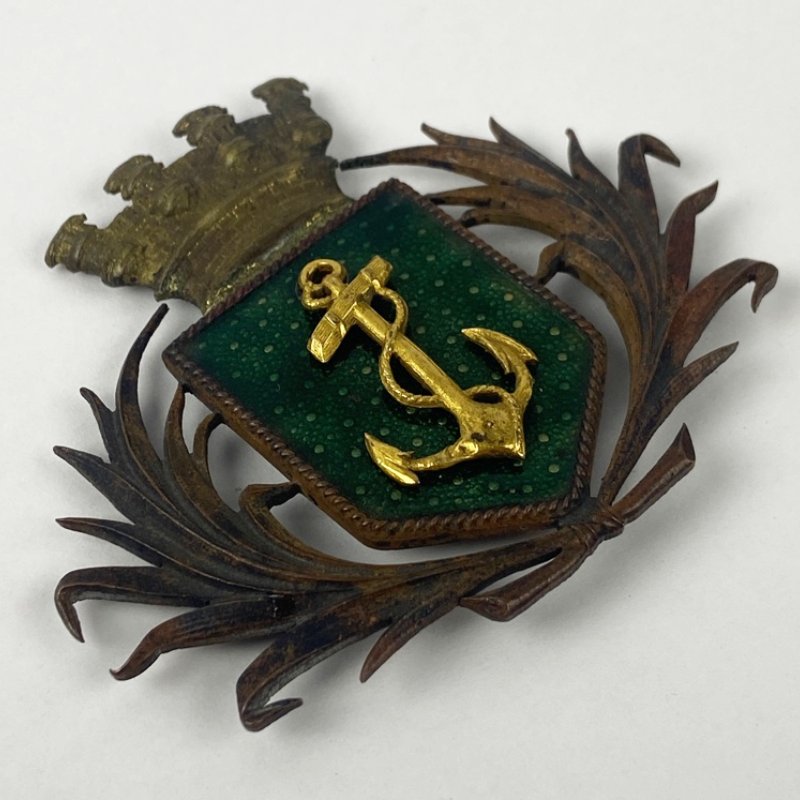 Modelo en bronce de época, con esmalte original verde y ancla en relieve dorado. Conserva pátina y oxidaciones visibles en la parte posterior, acordes a su antigüedad. Sistema de sujeción trasero mediante aguja, la cual falta.