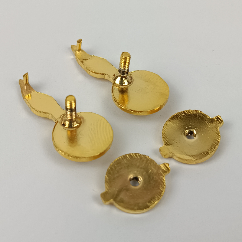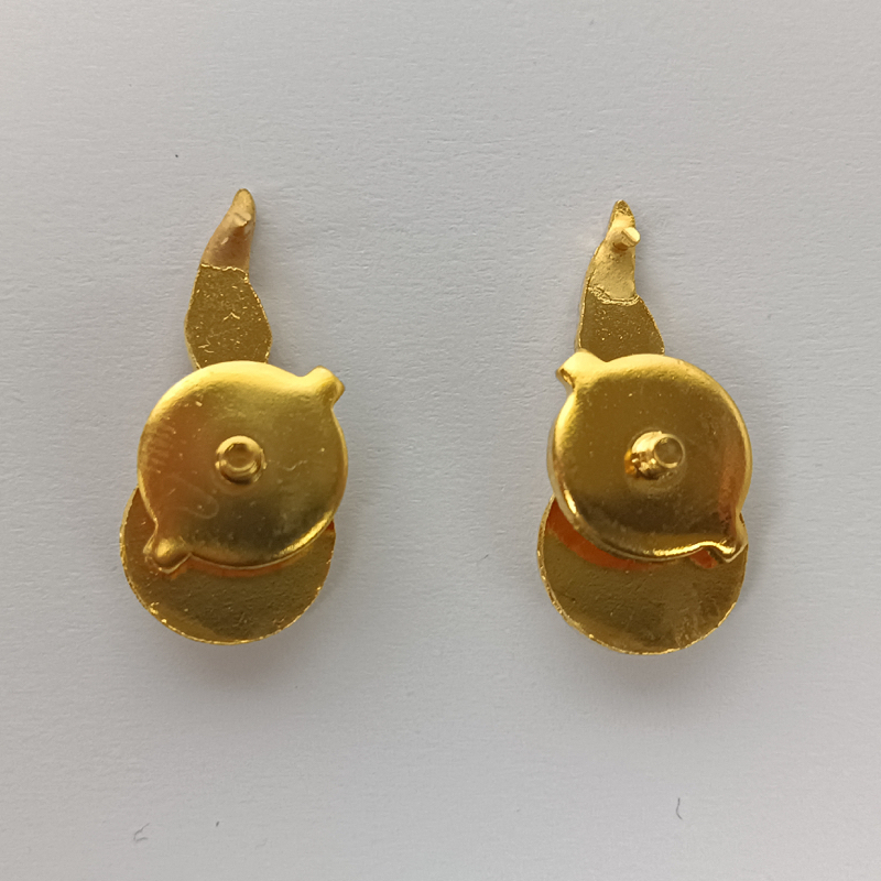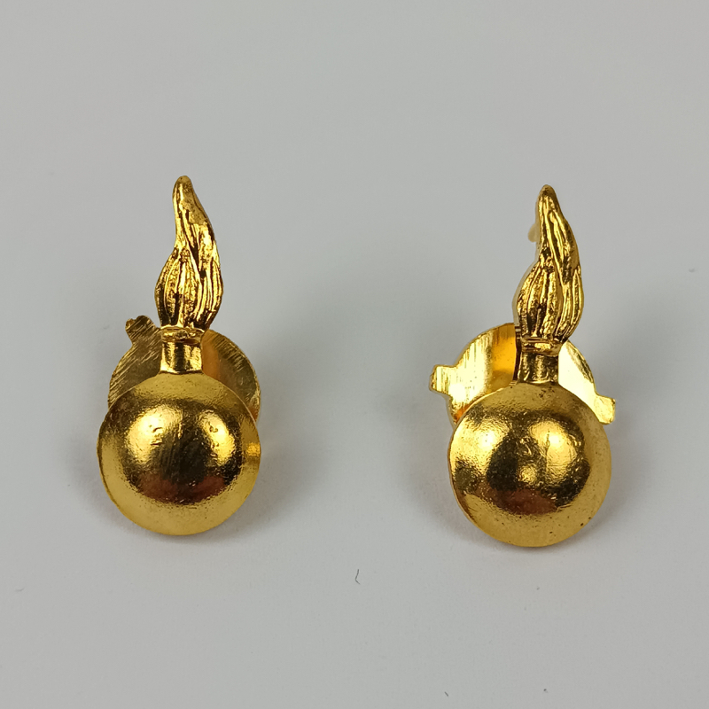 Distintivo metálico de color dorado con símbolo de bomba flamígera característico del arma de Artillería. En buen estado, con sistema de fijación mediante tornillo y tuerca en la parte posterior. Precio por pareja