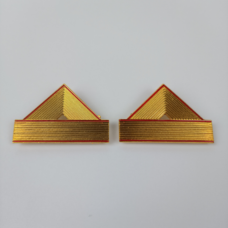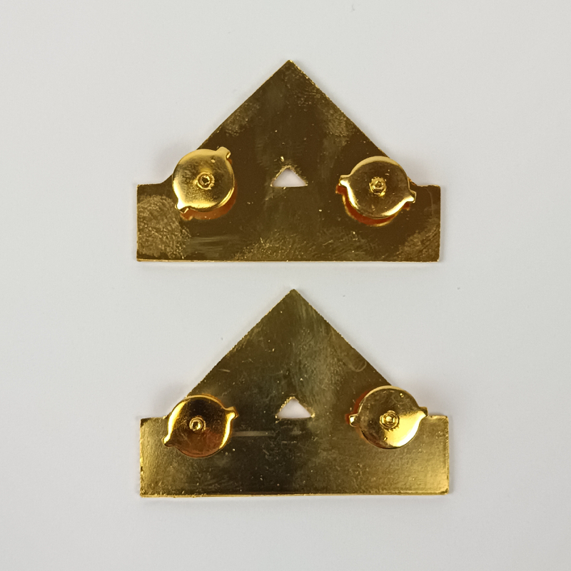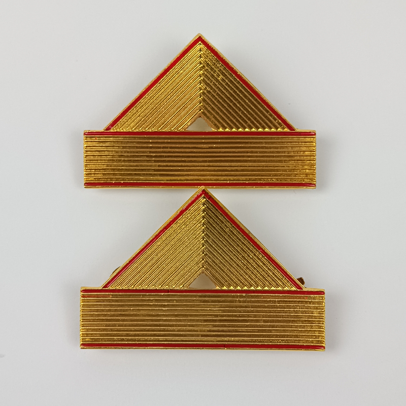 Distintivo metálico de color dorado con ribete en color rojo, correspondiente al empleo de Cabo Mayor.