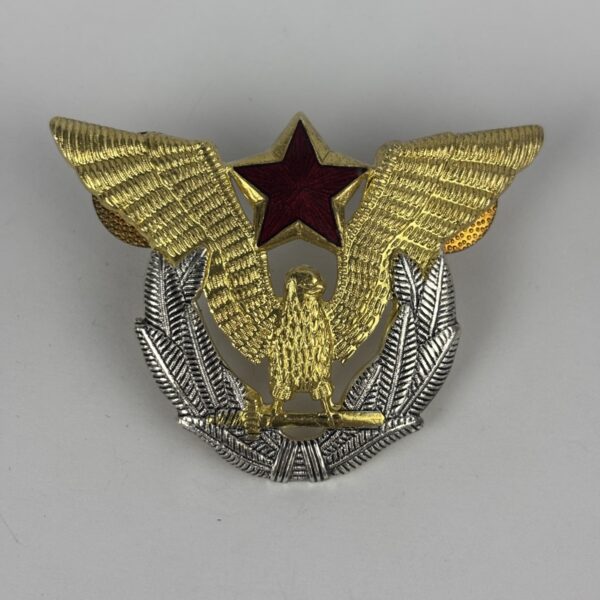 Fabricada de una sola pieza con dorado en el águila y esmalte rojo al fuego en la estrella superior de la misma. En la parte posterior lleva dos enganches de rosca, marcados, producida en Yugoslavia. Utilizado por la Fuerza Aerea.