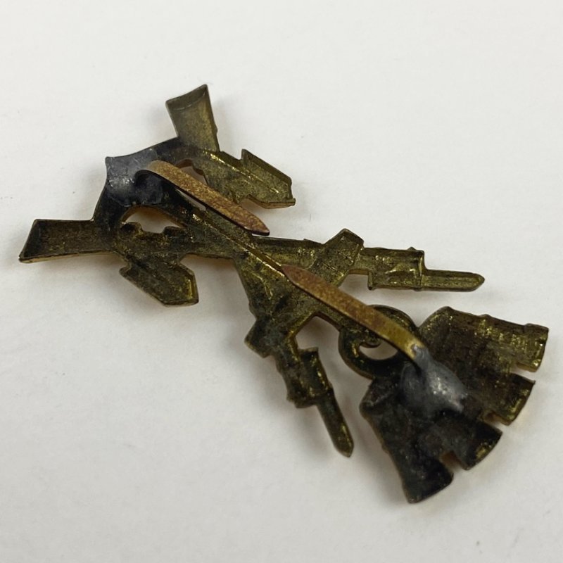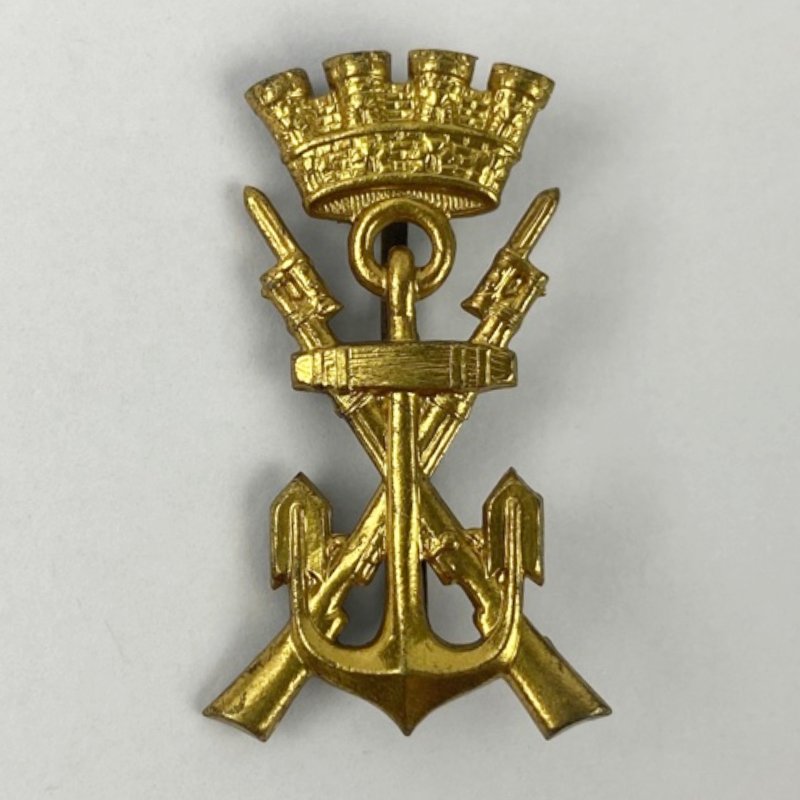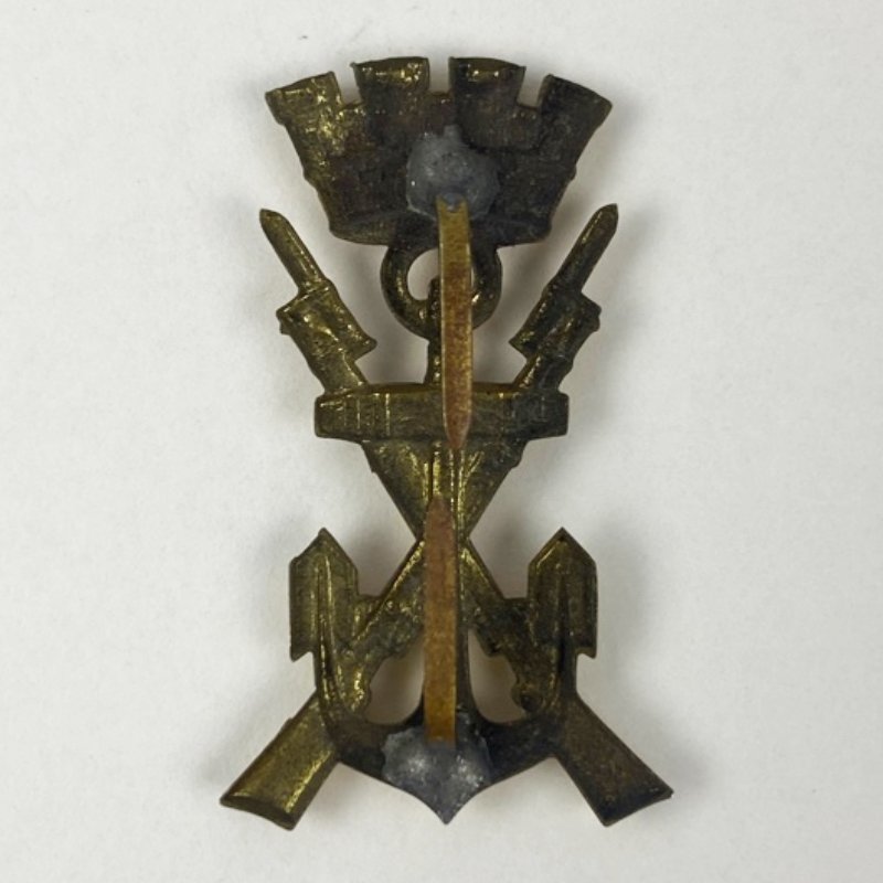 Insignia original correspondiente a la Infantería de Marina de la Armada española durante el periodo de la Segunda República (1931-1936). Modelo con corona mural republicana, símbolo oficial adoptado tras la proclamación de la República en sustitución de la corona real.