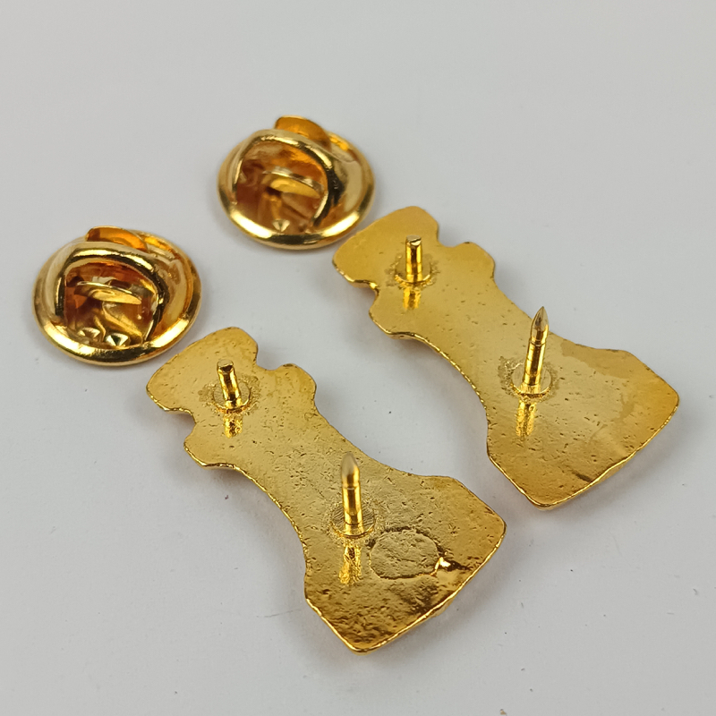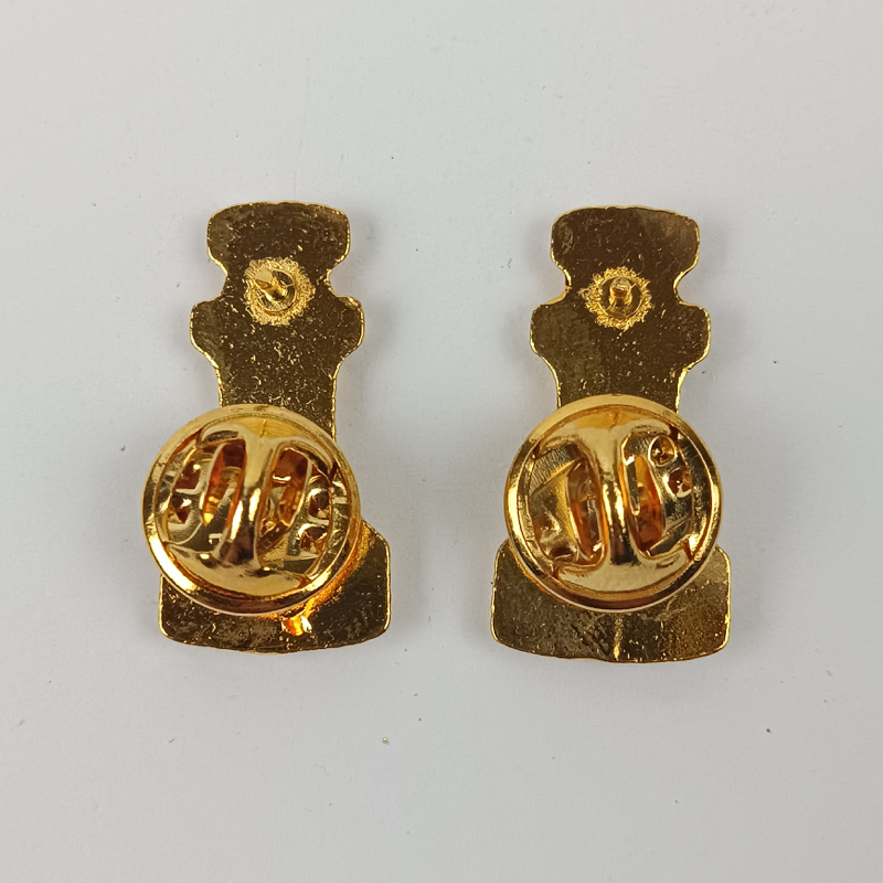 Insignia de Ingenieros del Ejército Español, modelo de latón con rosca en la parte posterior de los mismos para unir al uniforme. Completos en buen estado de conservación.
