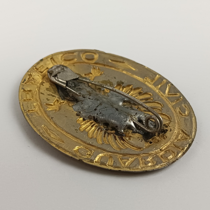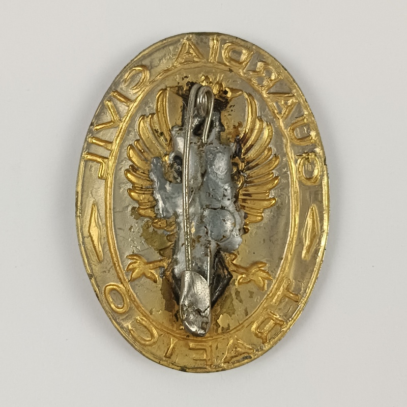 Placa metálica troquela con un águila y la cruz de Santiago, bajo la cual aparece el rombo con el emblema del cuerpo. Modelo de época de Franco con corona imperial. Medidas: 3,5 cm x 5 cm. Imperdible soldado en la parte posterior como repuesto por la perdida del original, reparación antiguad época.