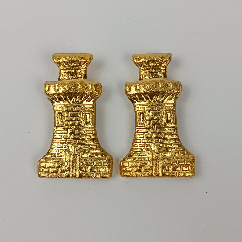 Distintivo metálico de color dorado con emblema en forma de castillo, característico del personal de ingenieros militares del Ejército Español. En buen estado, con sistema de fijación mediante pin en la parte posterior. Precio por pareja
