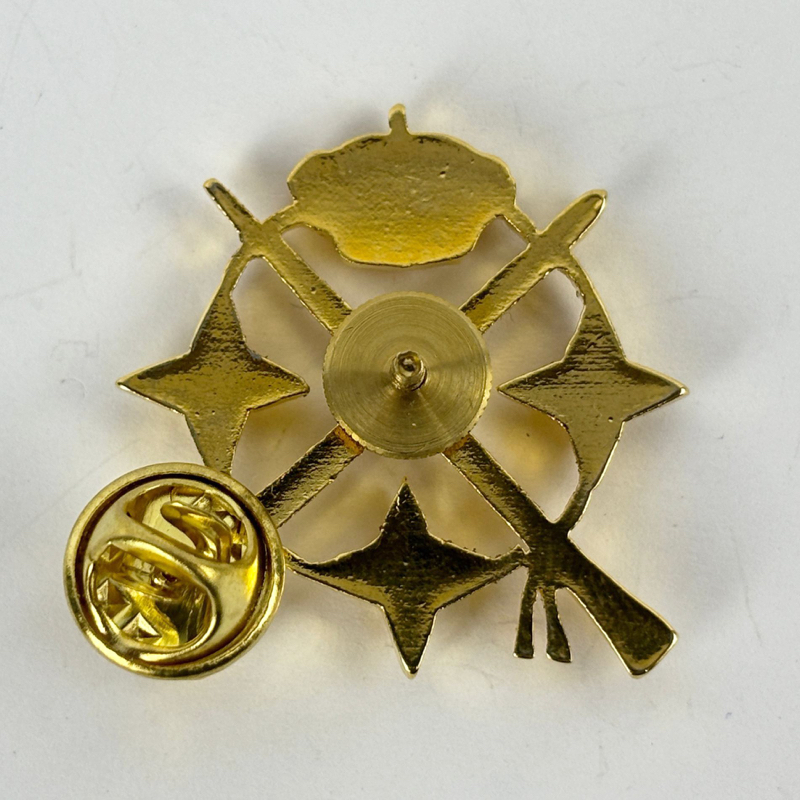 Distintivo metálico para uniforme, con sistema de sujeción posterior mediante rosca. Acabado dorado brillante con buen nivel de detalle en el relieve.