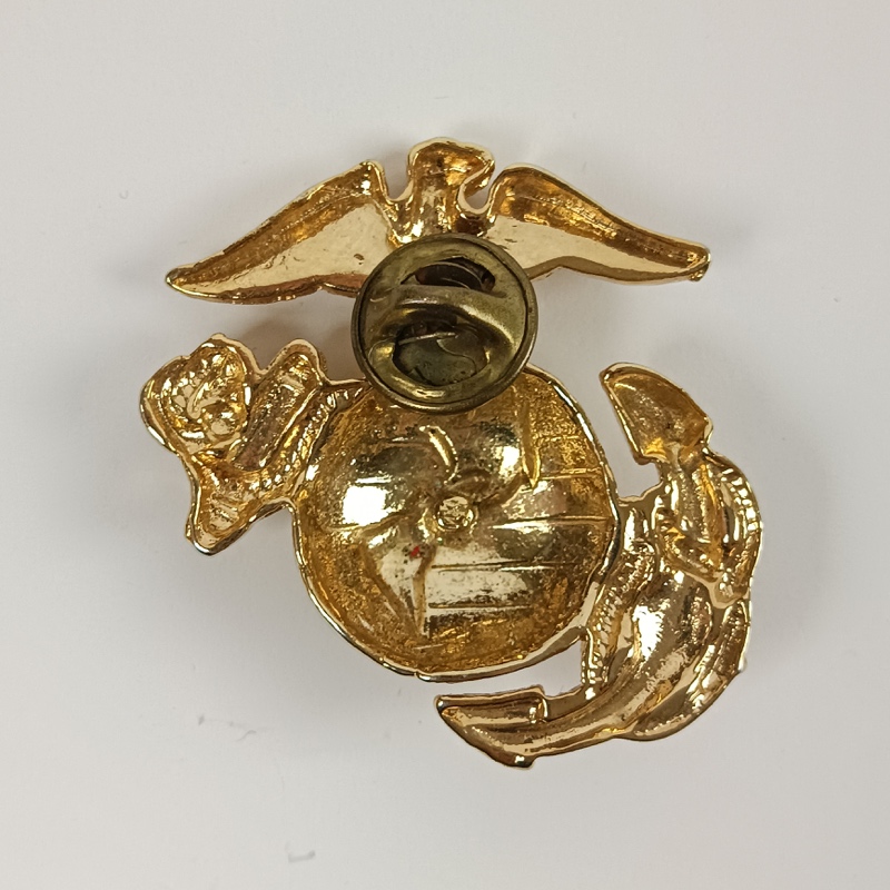 Presenta el emblema tradicional compuesto por un águila, un globo terráqueo y un ancla, símbolos del orgullo, alcance global y tradición naval del cuerpo. Acabado brillante y sistema de sujeción tipo pin en la parte posterior.