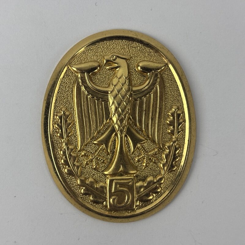 Insignia de latón estampado, con un águila en el centro rodeada por hojas de roble bajo la cual lleva el número 5. Enganche posterior para unir al cordón que se cuelga del brazo derecho del uniforme.