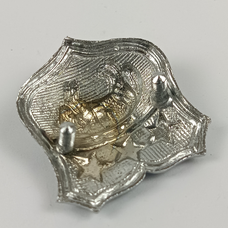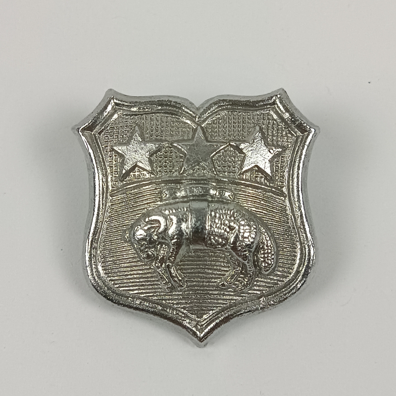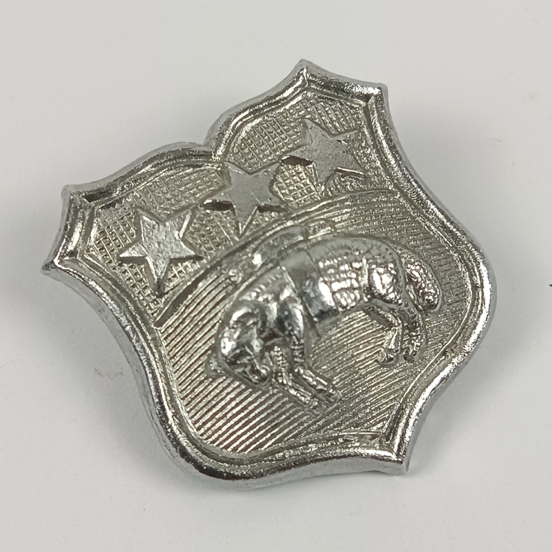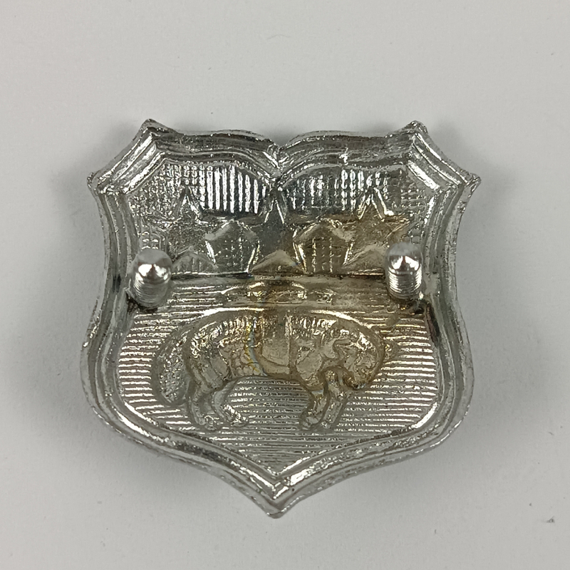 Insignia de cuello cromada de la Policía de la ciudad de Leeds, Reino Unido, anterior a la reorganización policial de 1974. Fabricada en metal cromado con diseño en forma de escudo, presenta tres estrellas en la parte superior y un carnero en el centro, símbolo heráldico tradicional asociado a la ciudad de Leeds.