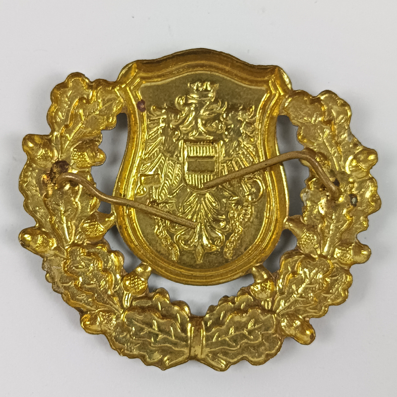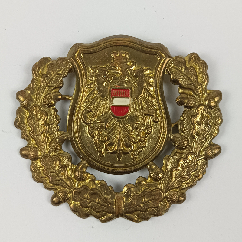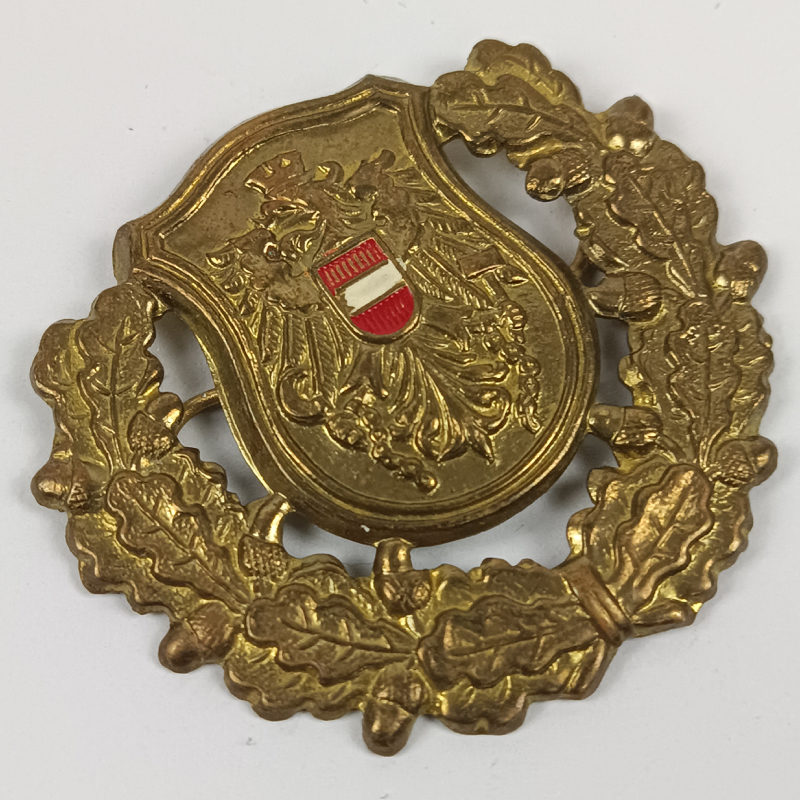 Insignia de gorra de la Policía Federal de Austria, fabricada en metal dorado para gorra de plato de oficial. Presenta el escudo nacional austríaco con águila bicéfala y escudo esmaltado en colores rojo y blanco en el centro, rodeado por una corona de hojas de roble.