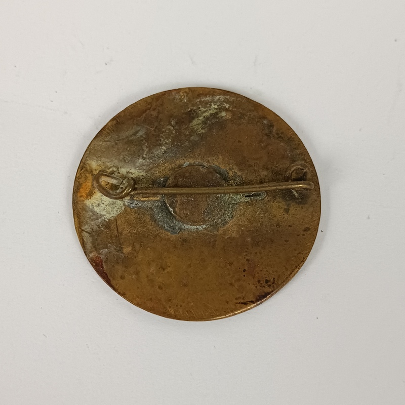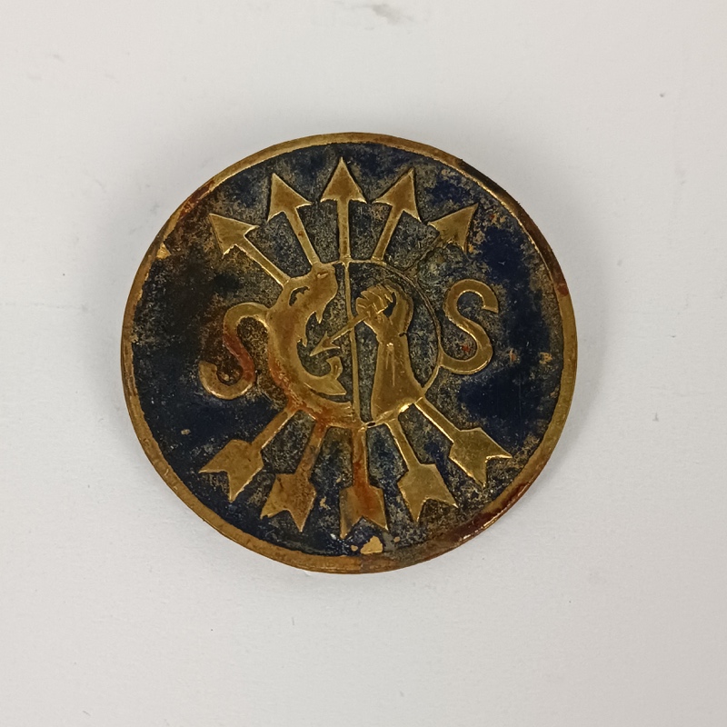 Realizada en latón estampado con fondo esmaltado azul y símbolo del yugo y las flechas, con emblema de Auxilio Social en el centro.