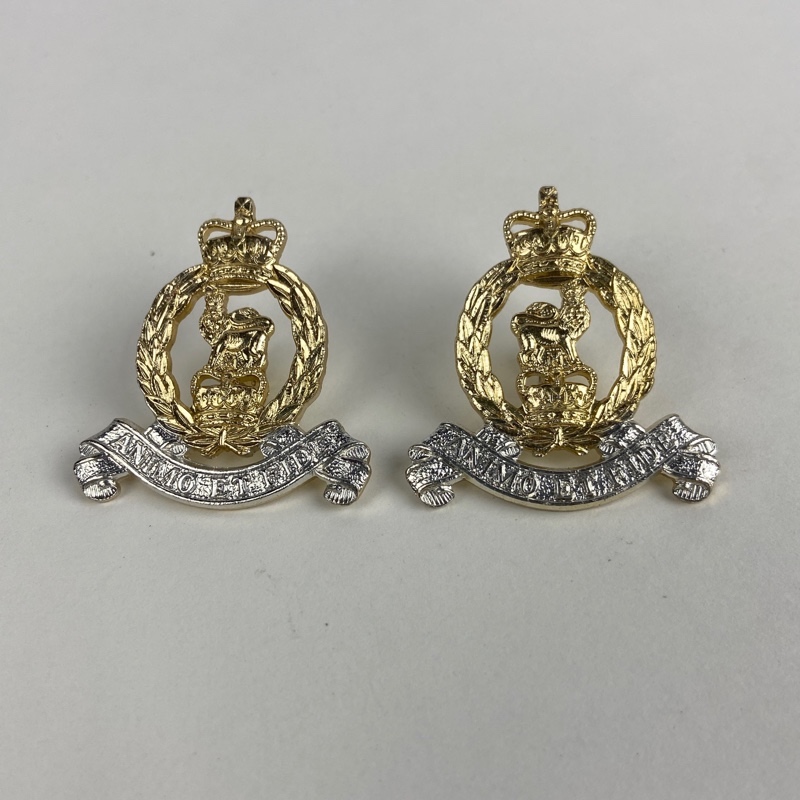 Conjunto de dos insignias metálicas originales del Adjutant General’s Corps del Ejército Británico, con corona real superior, corona de laurel y emblema central, acompañadas de cinta inferior con la leyenda “Animo et Fide”, lema tradicional heredado del Royal Army Service Corps.