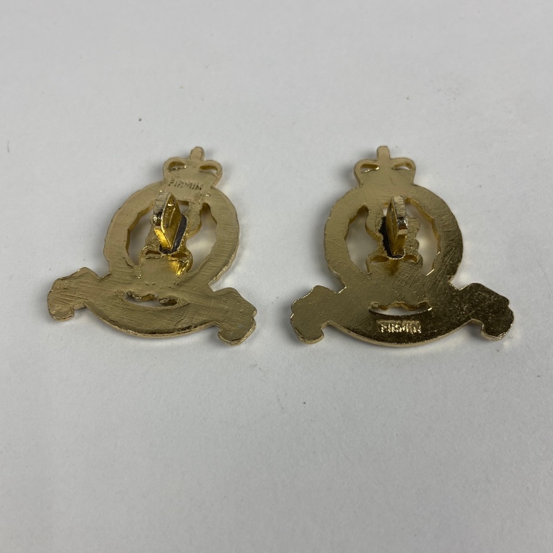Fabricadas en metal bicolor dorado y plateado. Reverso con sistema de fijación mediante pasador y marcaje del fabricante Firmin. Modelos utilizados en uniforme.
