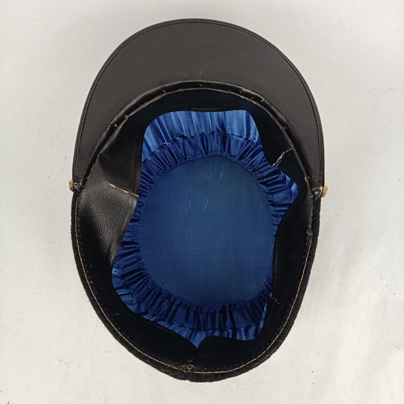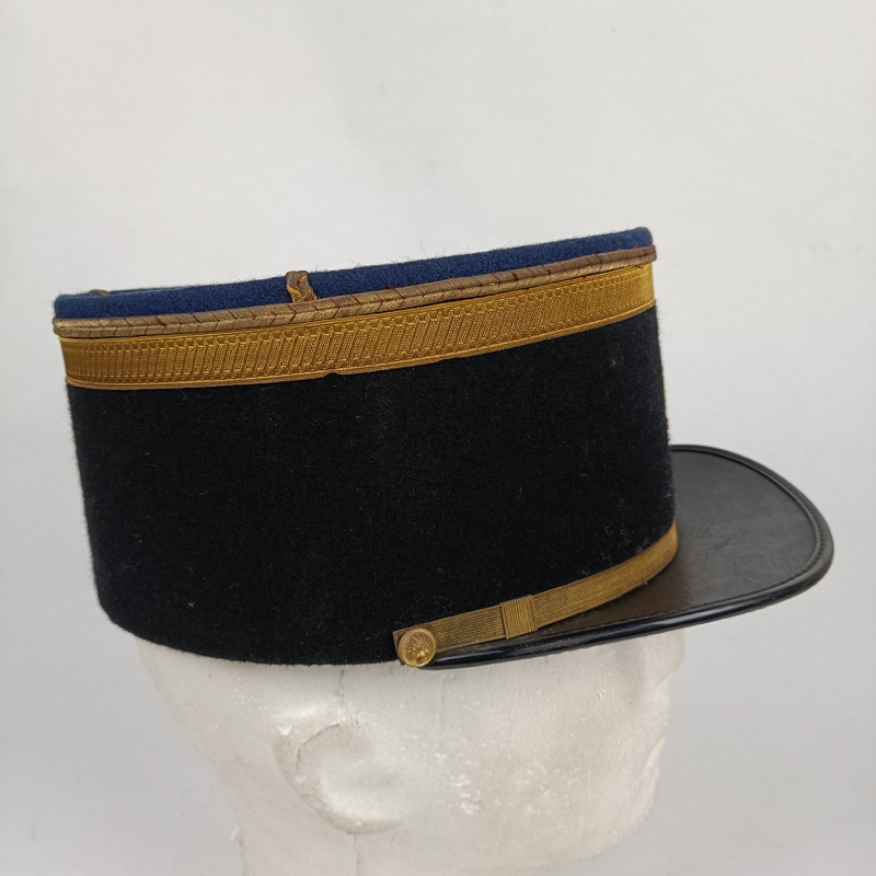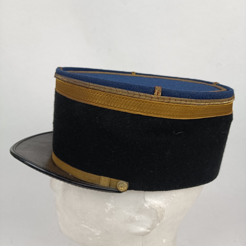 Gorro clásico de color azul oscuro que presenta galones dorados en la parte superior del mismo. Visera en charol negro y barboquejo dorado sujeto mediante dos botones en relieve en los extremos. Parte superior en azul oscuro.