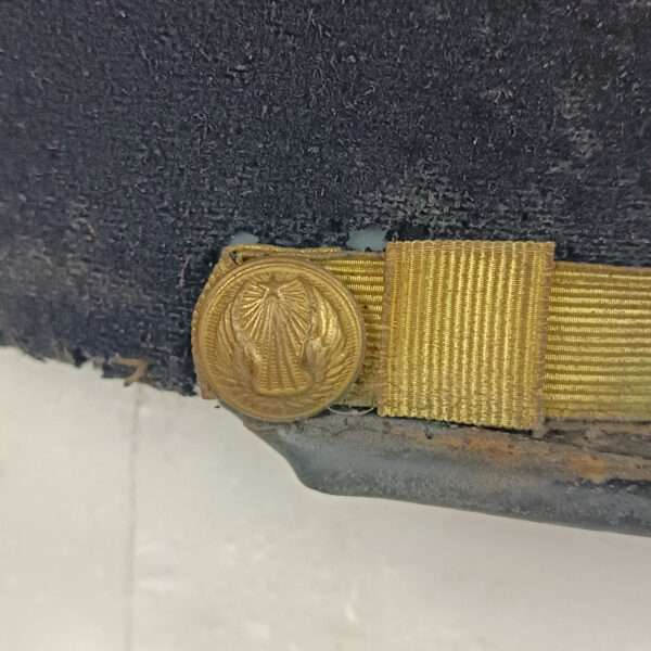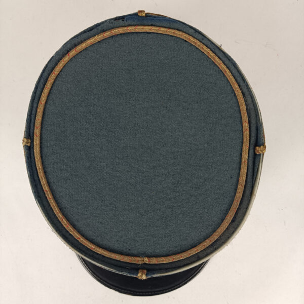 Gorro clásico de color azul oscuro que presenta galones dorados en la parte superior del mismo. Visera en charol negro y barboquejo dorado sujeto mediante dos botones en relieve en los extremos. Parte superior en azul claro.