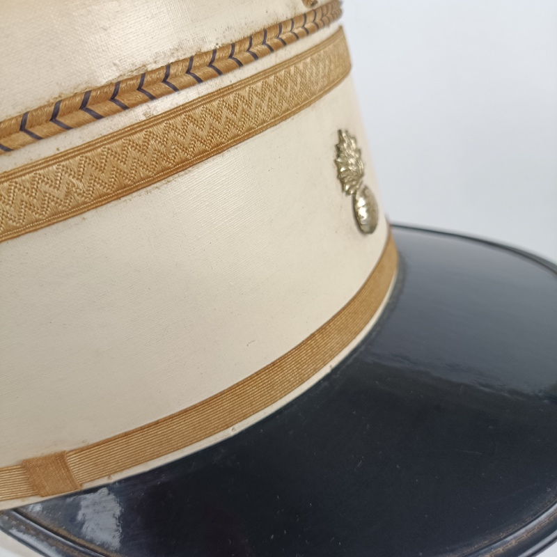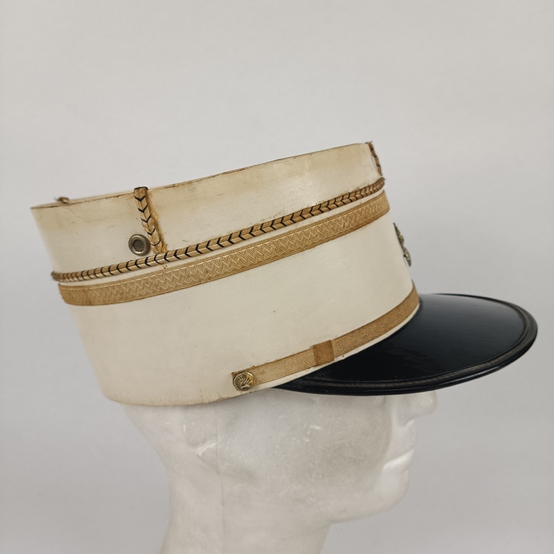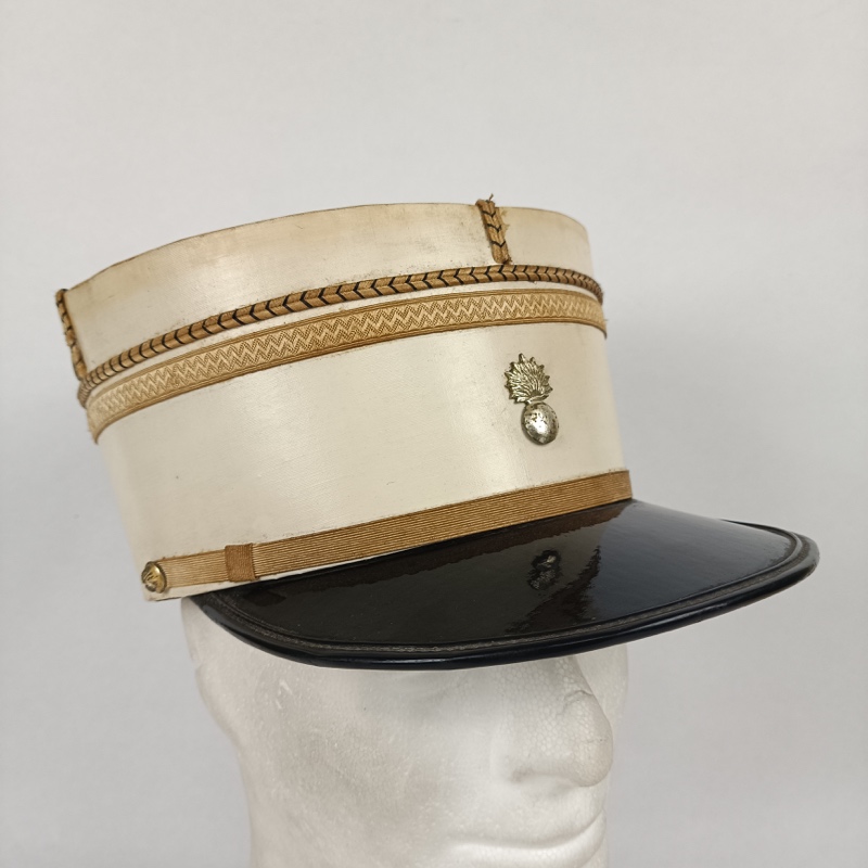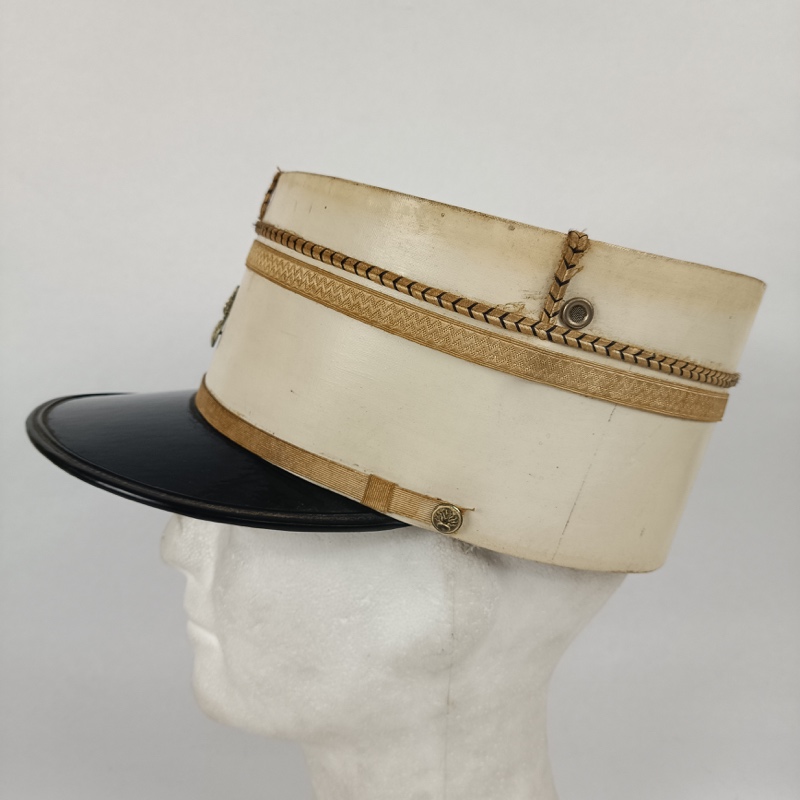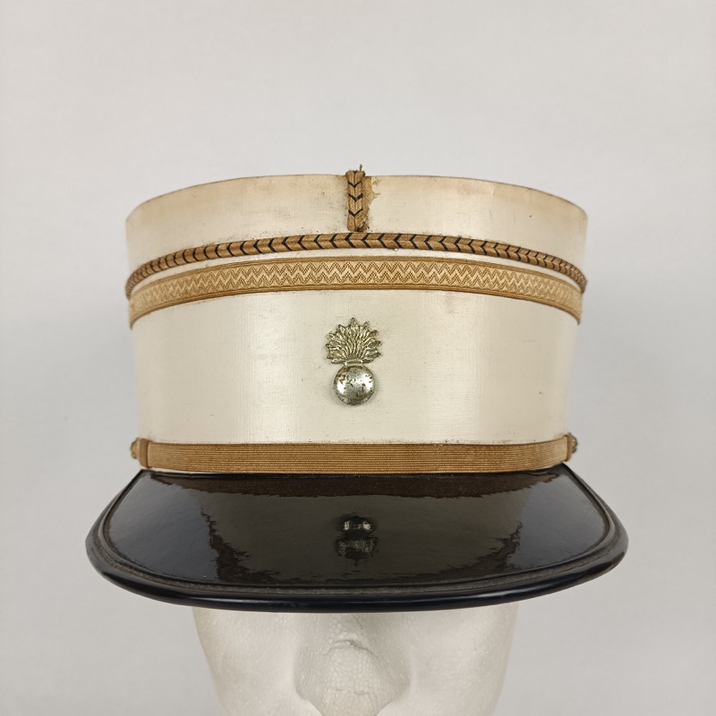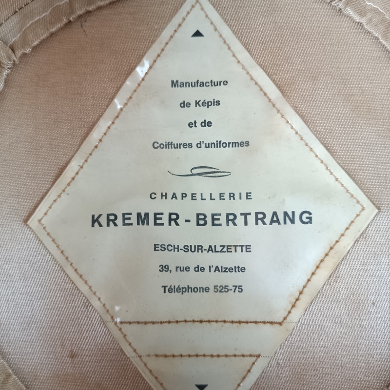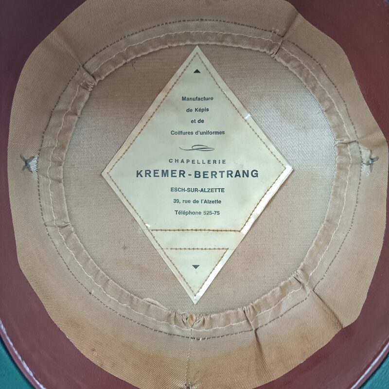 Modelo de gala en color blanco con detalles dorados y visera negra brillante. Ribetes decorativos y barboquejo en cinta dorada. En el frontal, insignia metálica en forma de granada flamígera. Interior con etiqueta original de la Chapellerie Kremer-Bertrang, Esch-sur-Alzette. Muy buen estado de conservación, con signos leves de uso propios del tiempo.