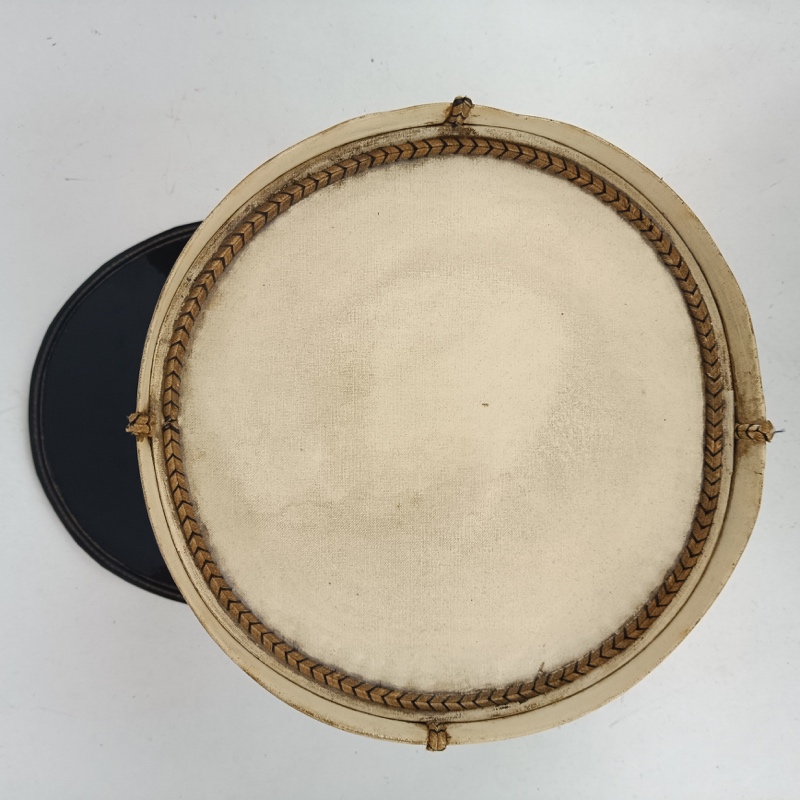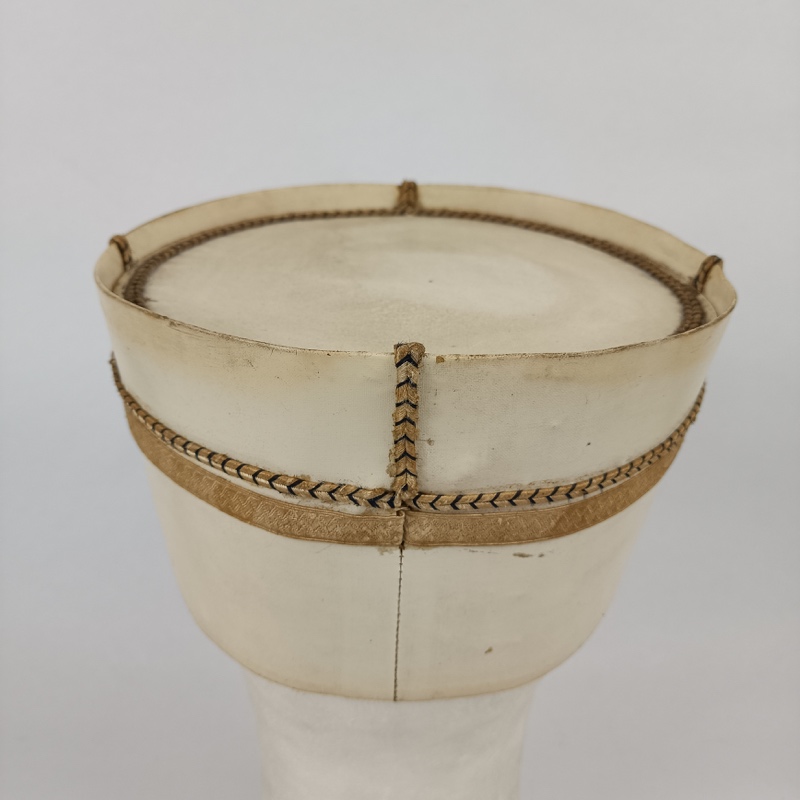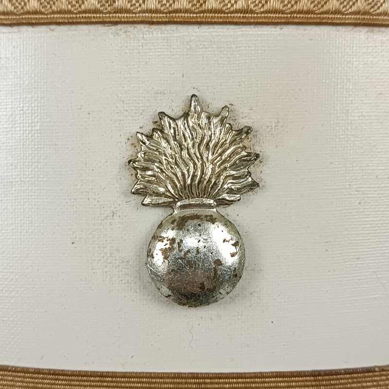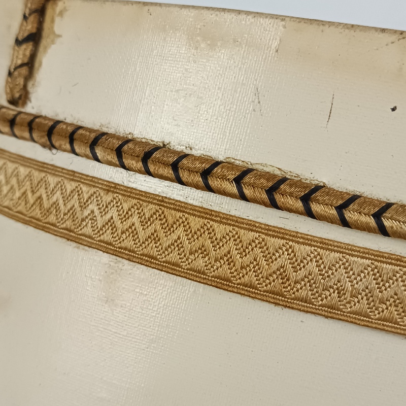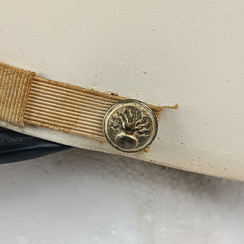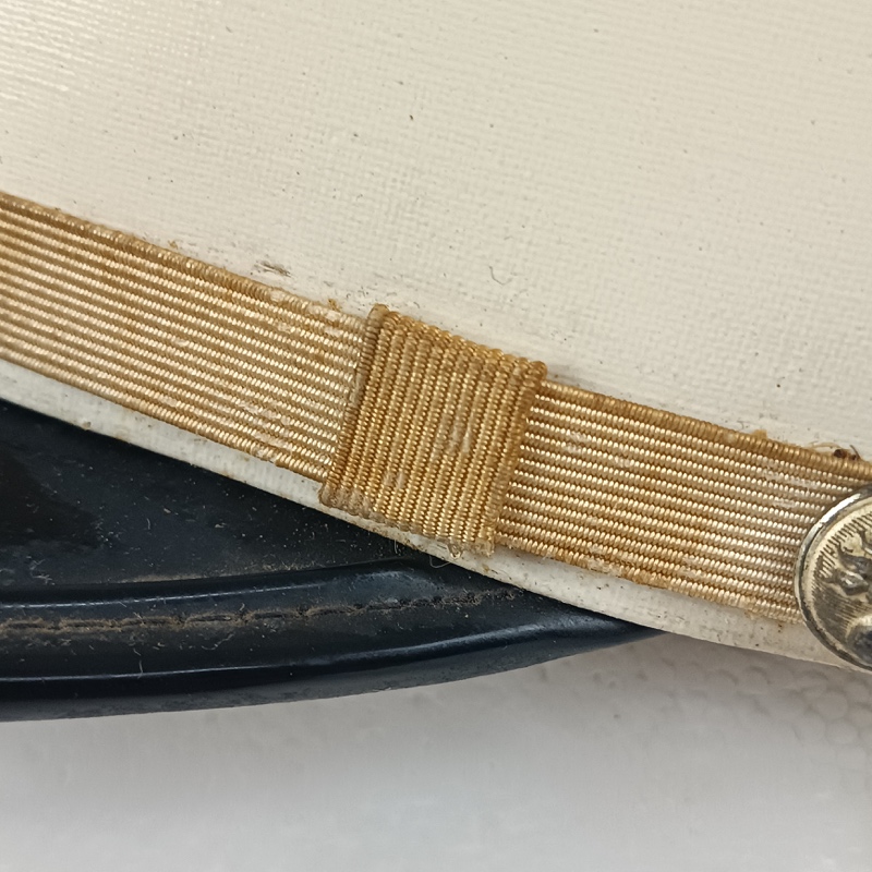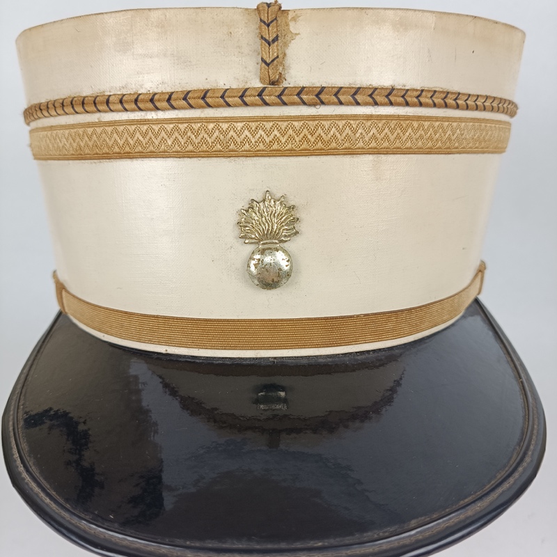 Modelo de gala en color blanco con detalles dorados y visera negra brillante. Ribetes decorativos y barboquejo en cinta dorada. En el frontal, insignia metálica en forma de granada flamígera. Interior con etiqueta original de la Chapellerie Kremer-Bertrang, Esch-sur-Alzette. Muy buen estado de conservación, con signos leves de uso propios del tiempo.