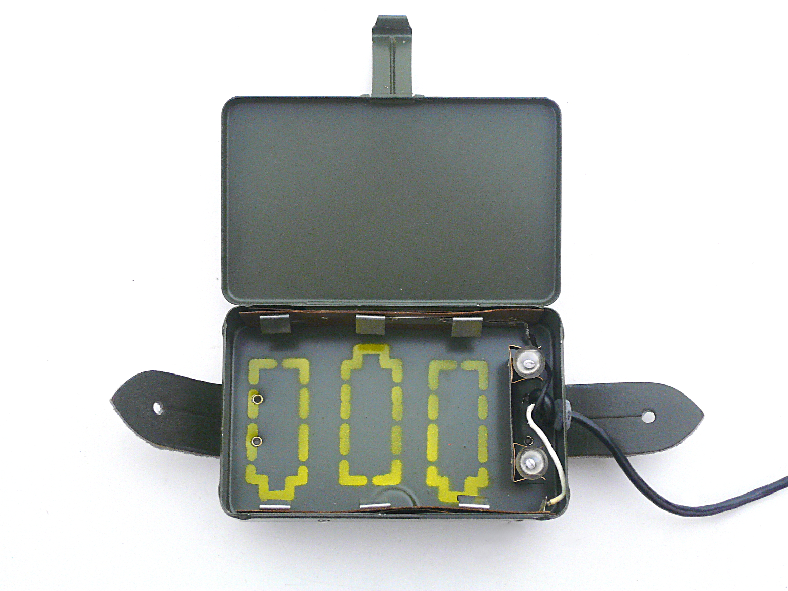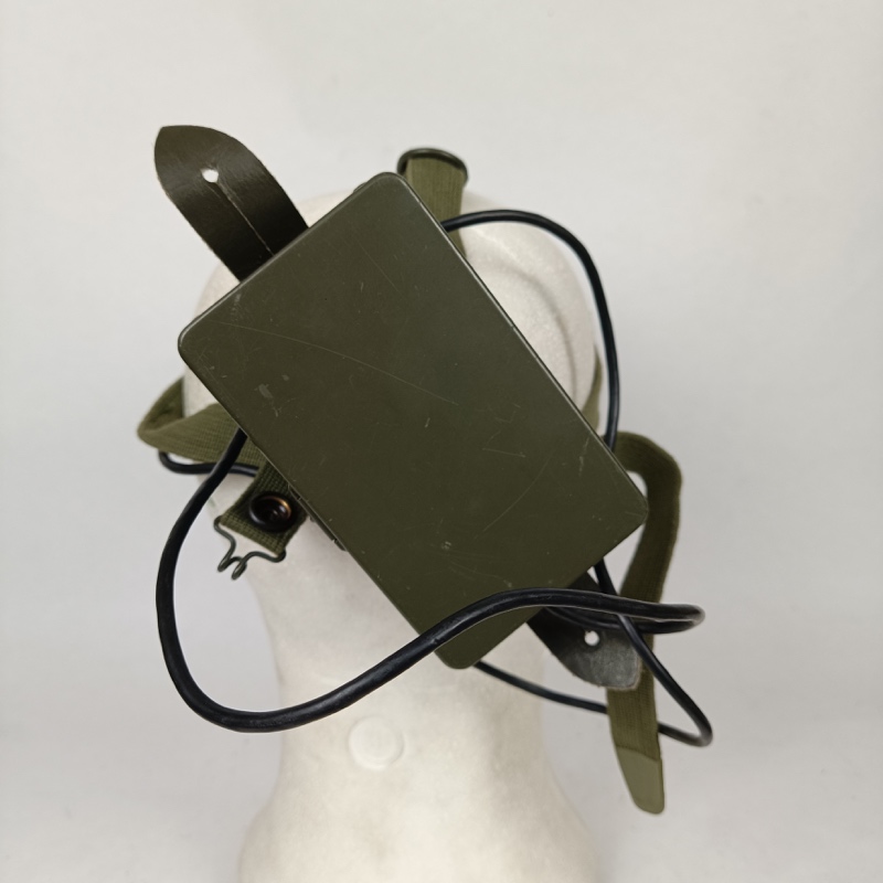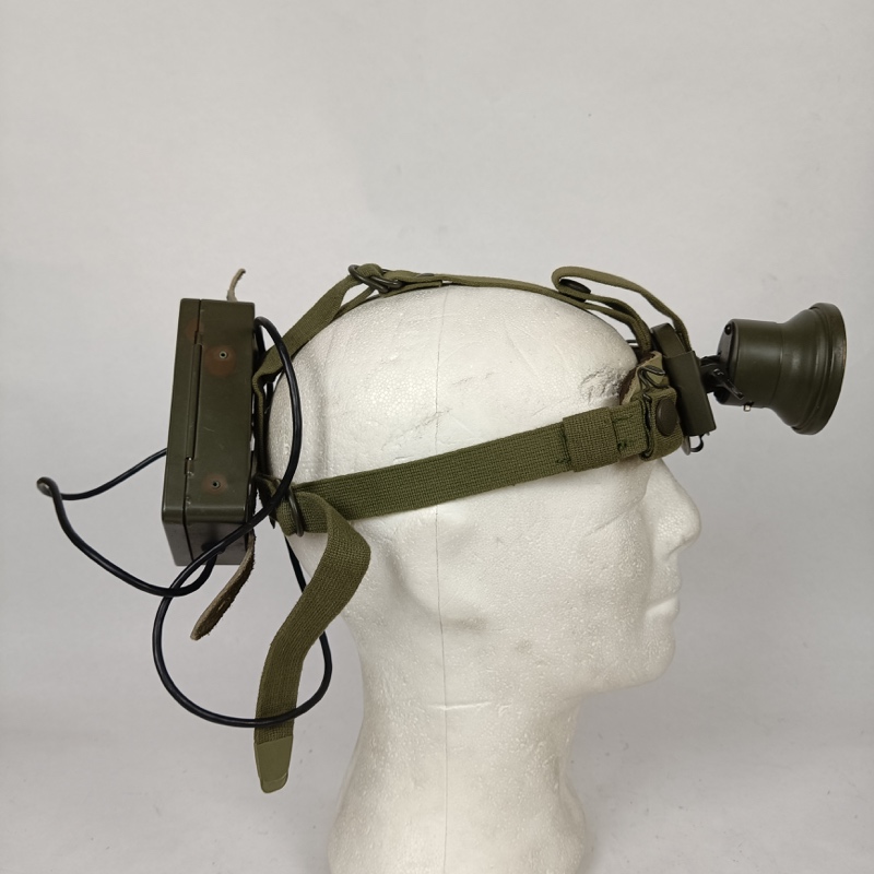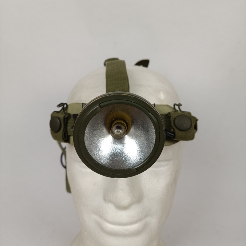 Linterna frontal militar original del ejército sueco, modelo utilizado aproximadamente entre las décadas de 1960 y 1980. Construcción totalmente metálica en color verde oliva.
