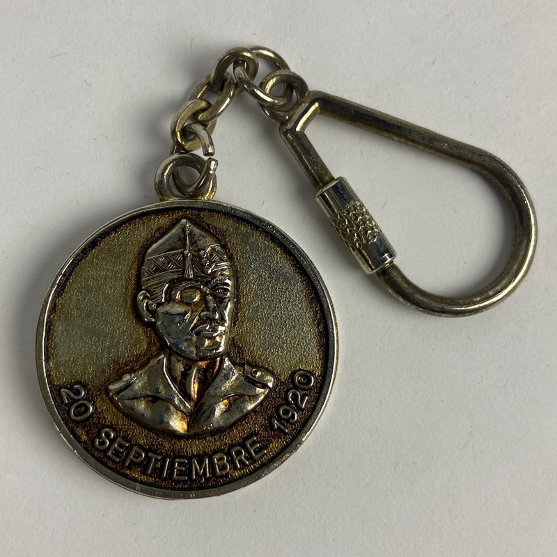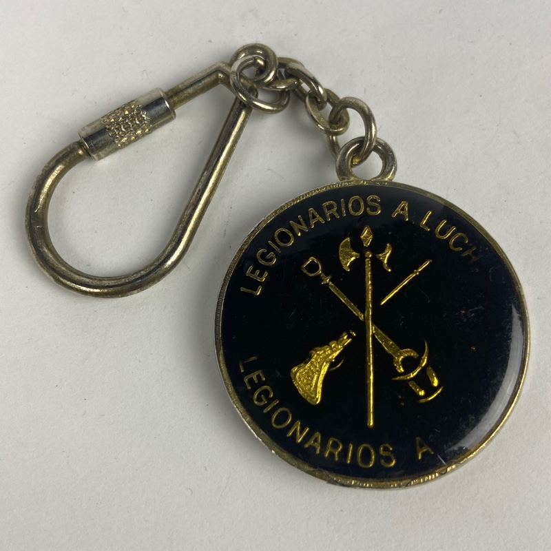 Llavero metálico esmaltado con el emblema de La Legión y la inscripción “Legionarios a luchar”. En el reverso figura el relieve de Millán-Astray con la fecha 20 de septiembre de 1920, conmemorando la fundación de La Legión Española.