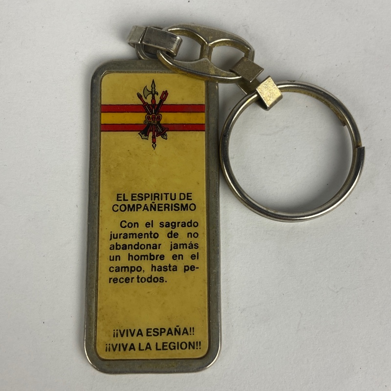 Llavero metálico rectangular con el emblema legionario y el texto “El espíritu de compañerismo”, símbolo del juramento legionario, acompañado del lema “¡Viva España! ¡Viva La Legión!”.